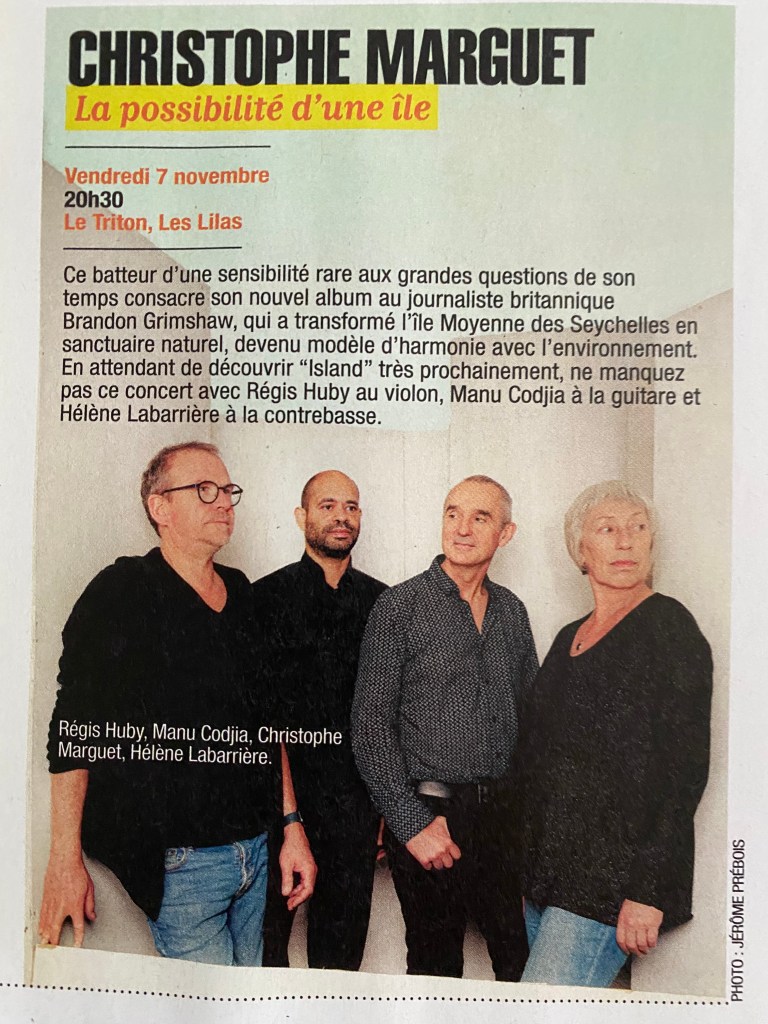 Island Photo Jérôme Prébois ISLAND Régis Huby : Violon ténor électro-acoustiqueManu Codjia : Guitare électriqueHélène Labarrière : Contrebasse Christophe Marguet : Batterie, compositions Production : Mélodie en sous-sol PRESSE COMPLÈTE