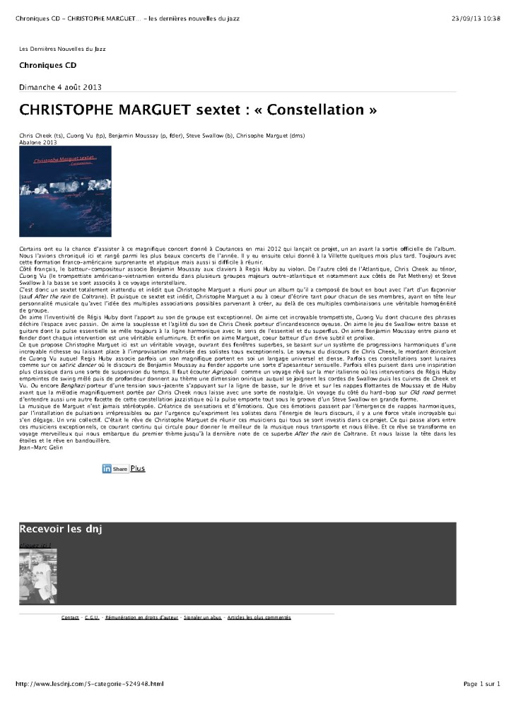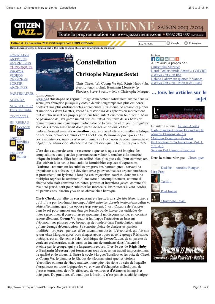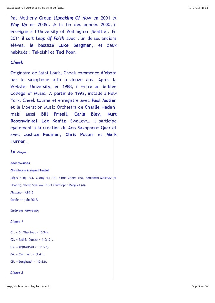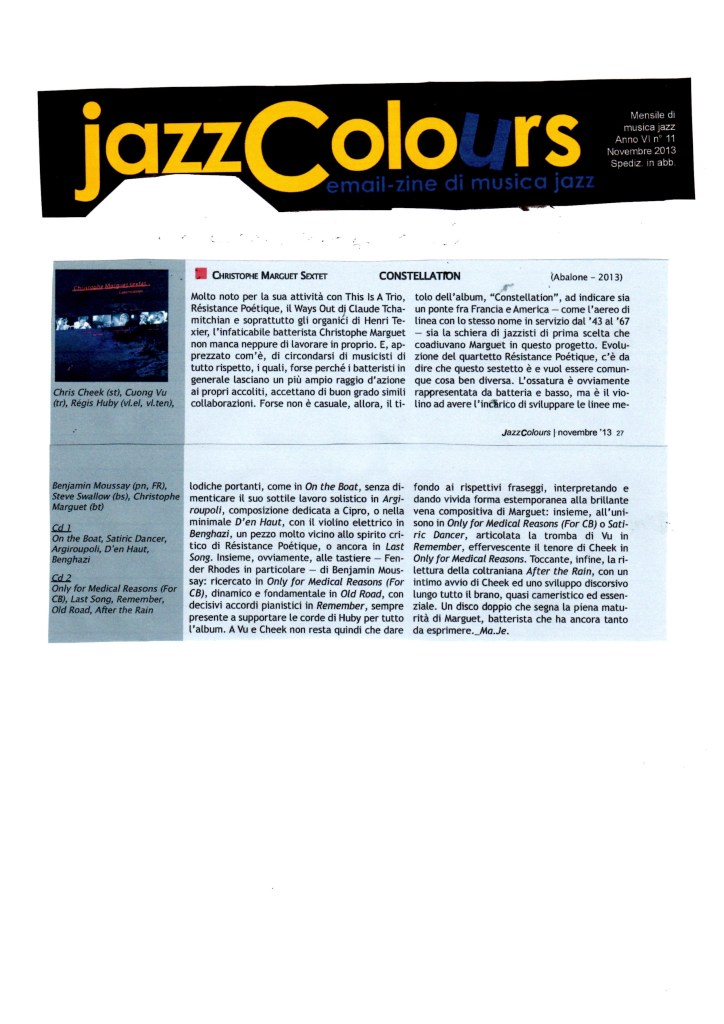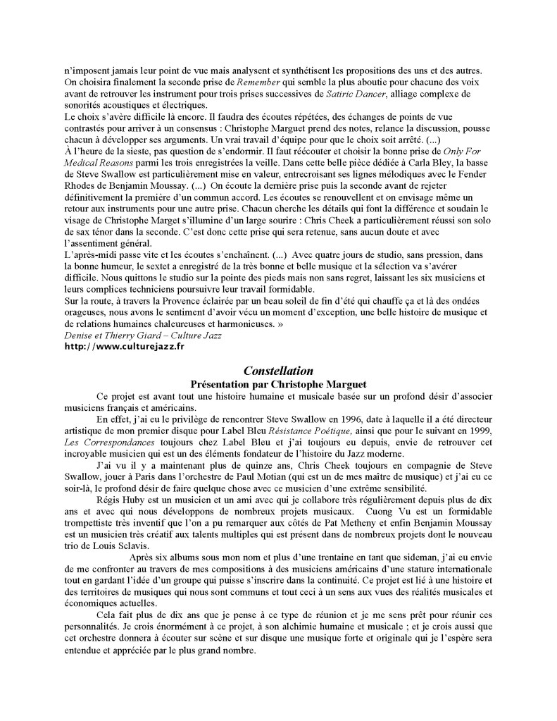 Régis Huby : Violon, Violon ténor Cuong Vu : Trompette Chris Cheek : Saxophone ténor Benjamin Moussay : Piano, Fender Rhodes Steve Swallow : Basse électrique Christophe Marguet : Batterie, compositions Enregistré les 4,5,6 septembre 2012 par Gérard de Haro aux Studios La Buissonne à Pernes-les-Fontaines (84) et mixé du 11 au 14 décembre 2012 par Sylvain Thévenard au Studio Border à Bagnolet (93) Abalone Productions