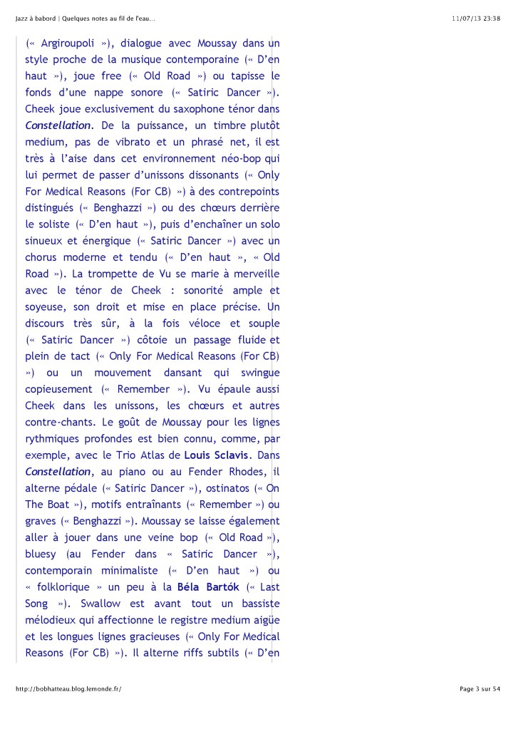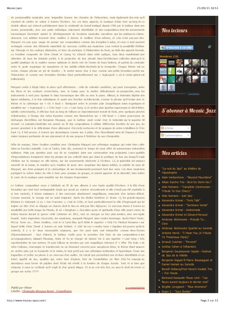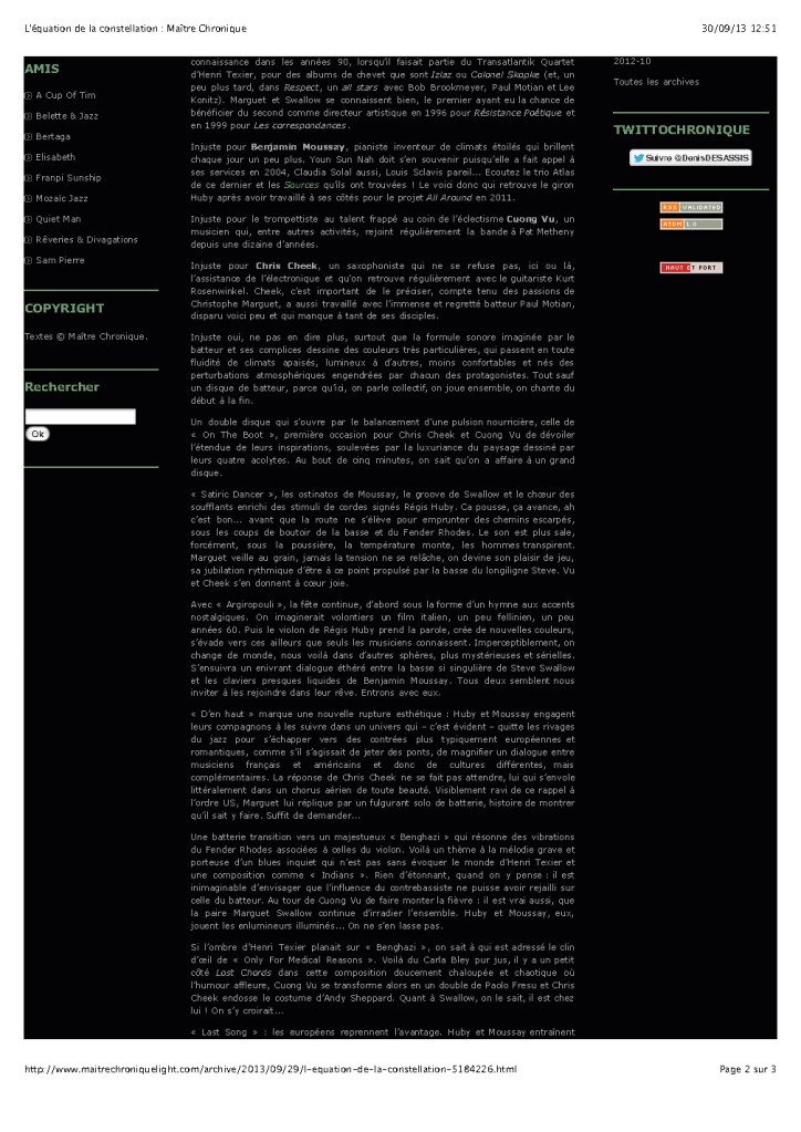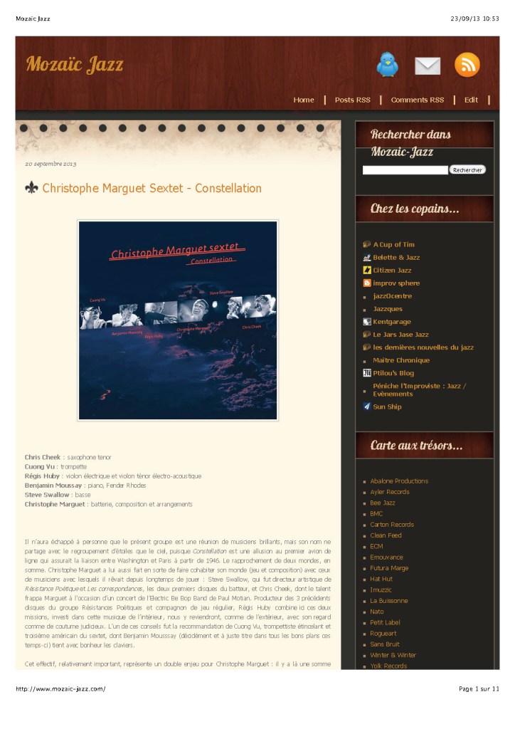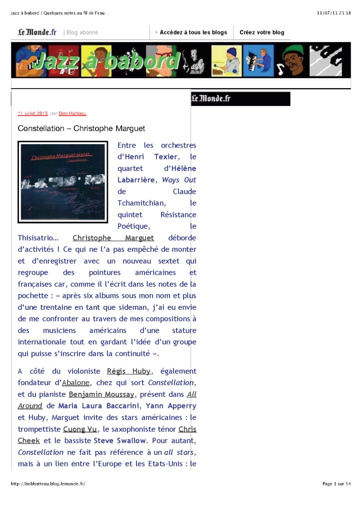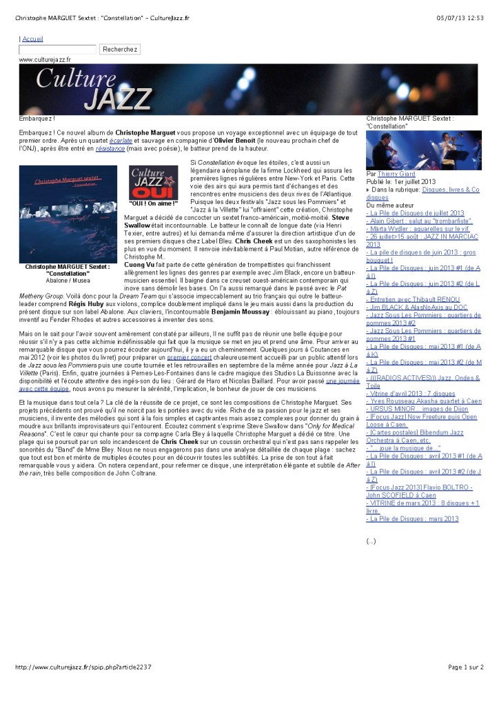 Régis Huby : Violon, Violon ténor Cuong Vu : Trompette Chris Cheek : Saxophone ténor Benjamin Moussay : Piano, Fender Rhodes Steve Swallow : Basse électrique Christophe Marguet : Batterie, compositions Enregistré les 4,5,6 septembre 2012 par Gérard de Haro aux Studios La Buissonne à Pernes-les-Fontaines (84) et mixé du 11 au 14 décembre 2012 par Sylvain Thévenard au Studio Border à Bagnolet (93) Abalone Productions