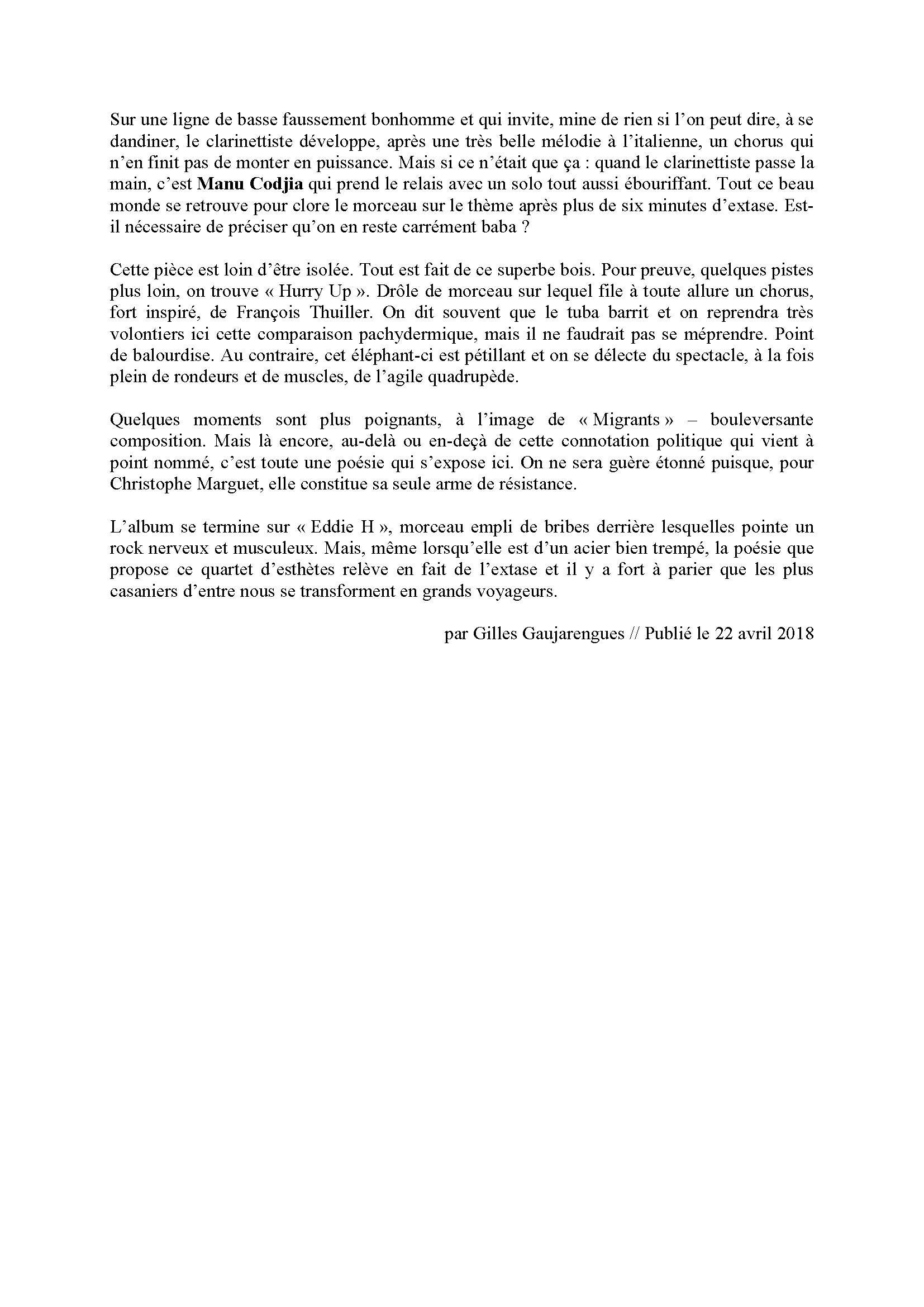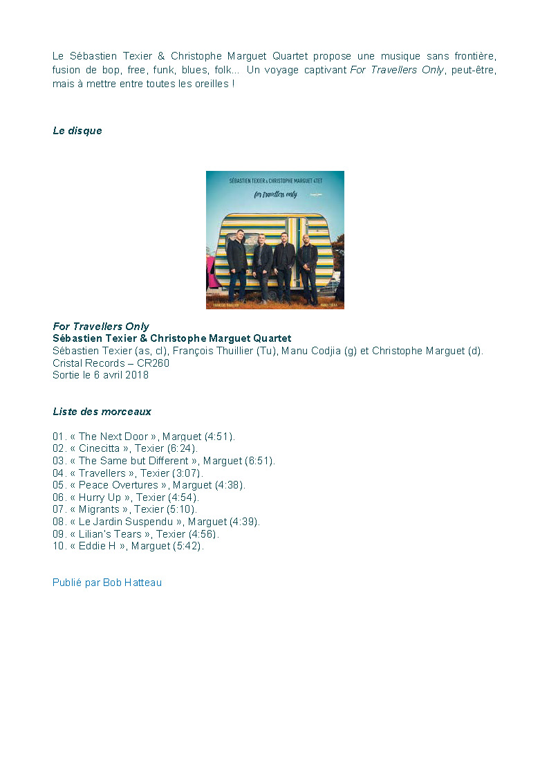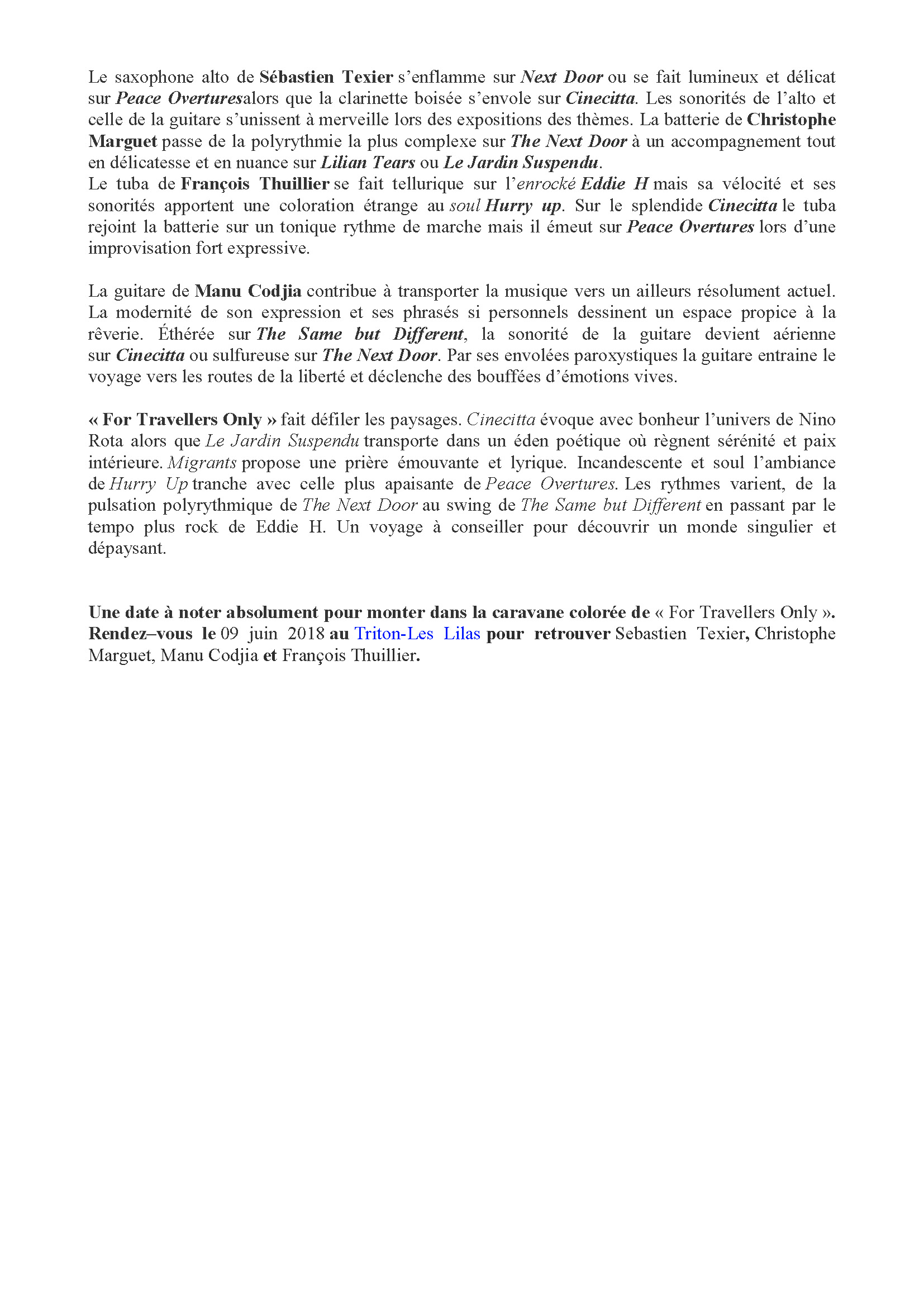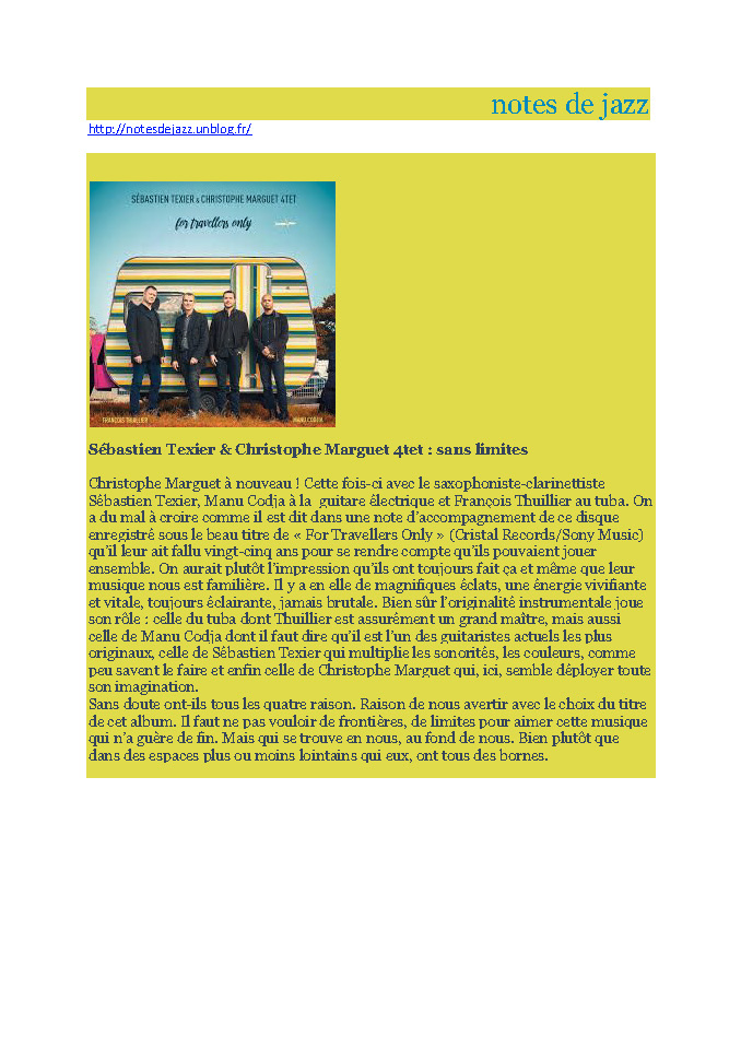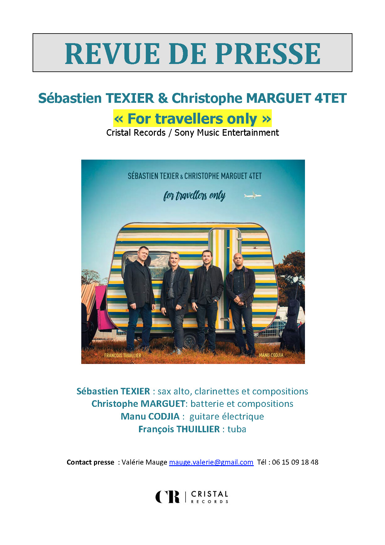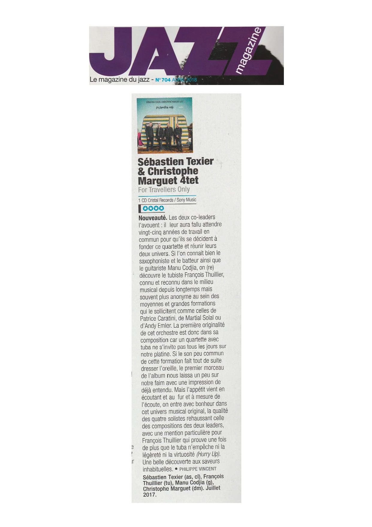 Sébastien Texier : Clarinettes, saxophone alto, compositions Manu Codjia : Guitare François Thuillier : Tuba Christophe Marguet : Batterie, compositions