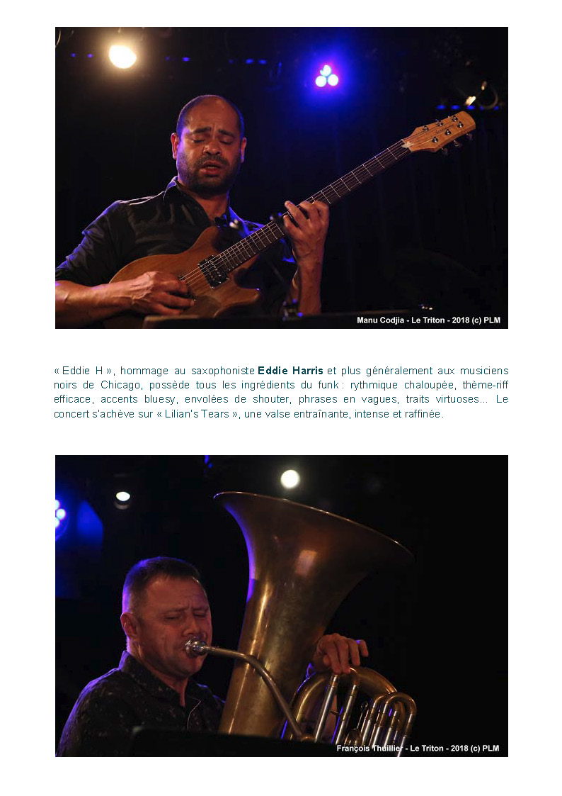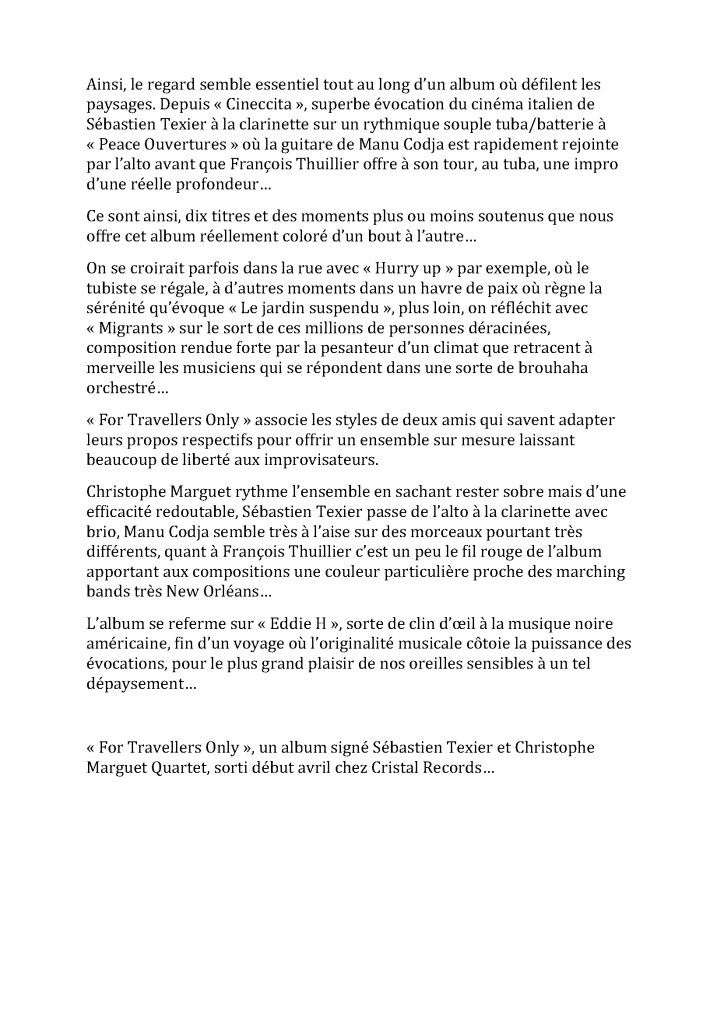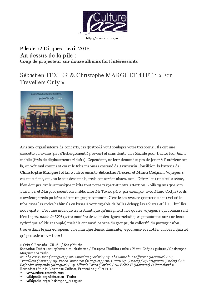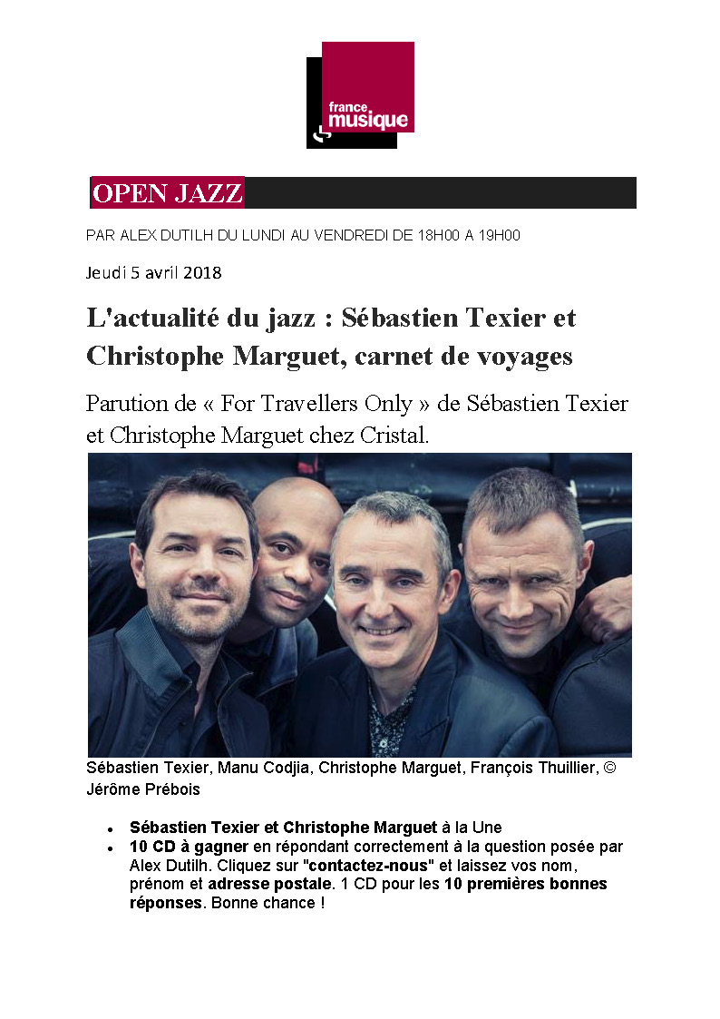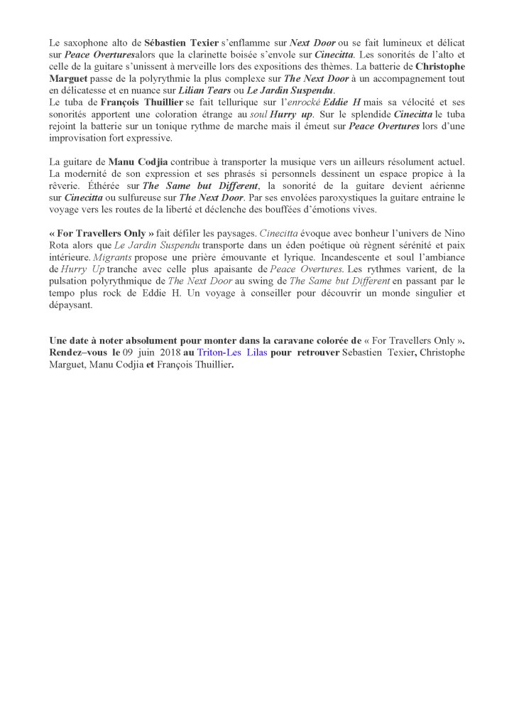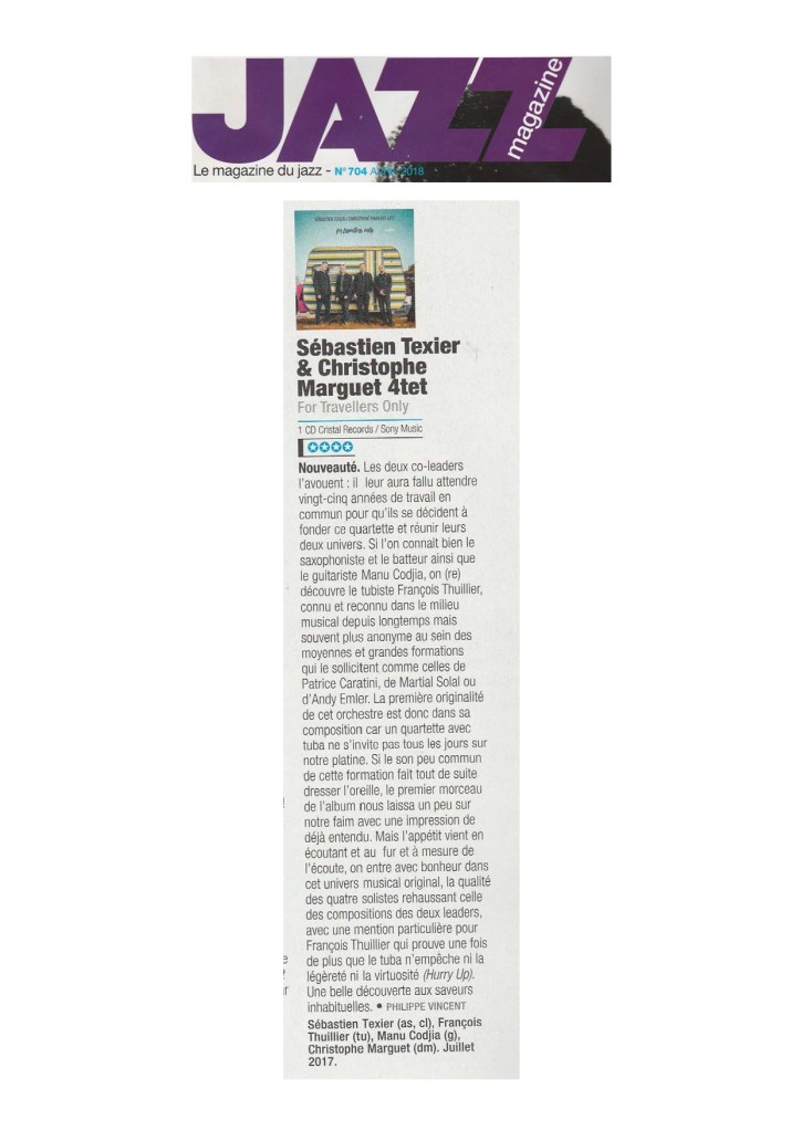 Sébastien Texier : Clarinettes, saxophone alto, compositions Manu Codjia : Guitare François Thuillier : Tuba Christophe Marguet : Batterie, compositions