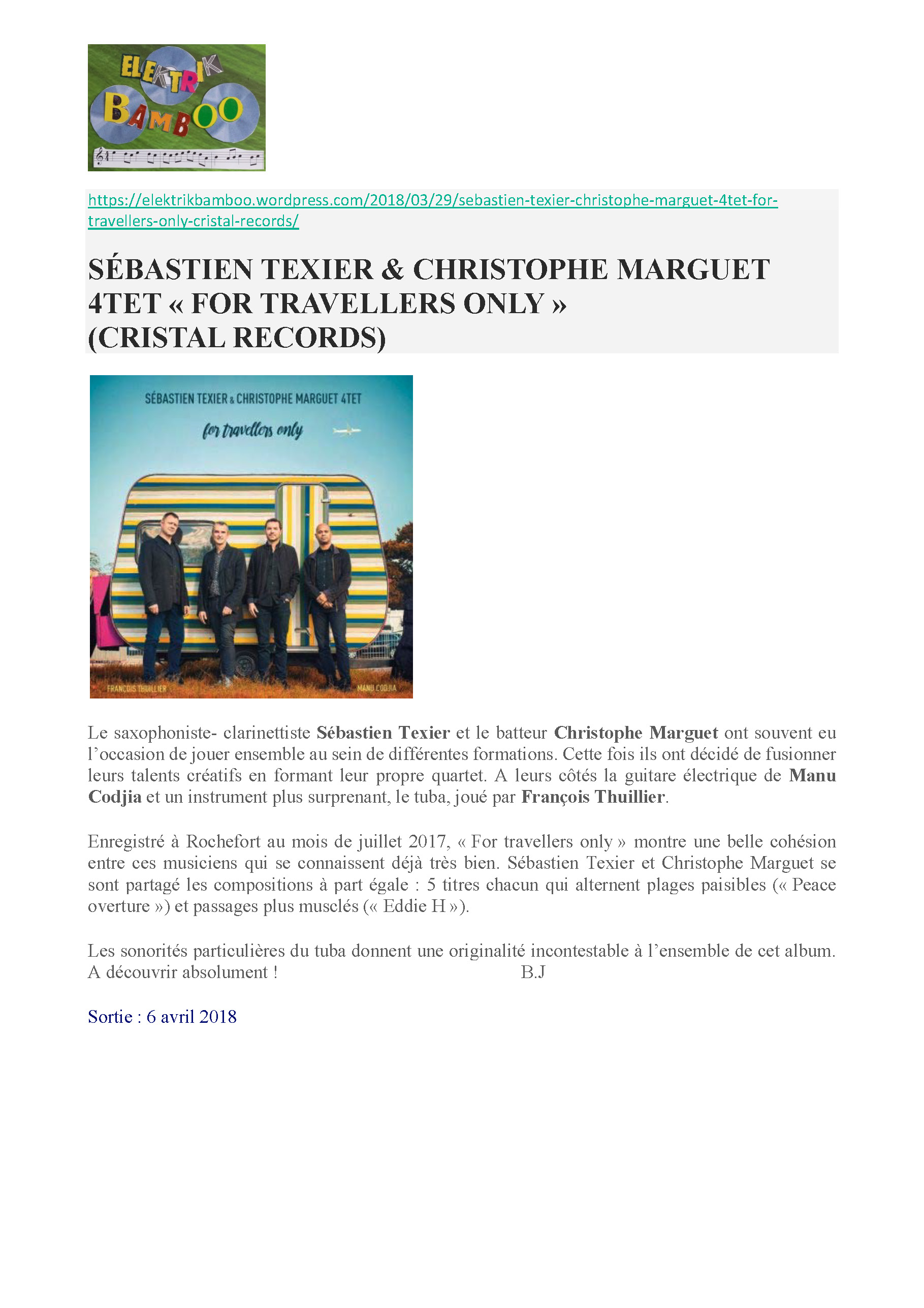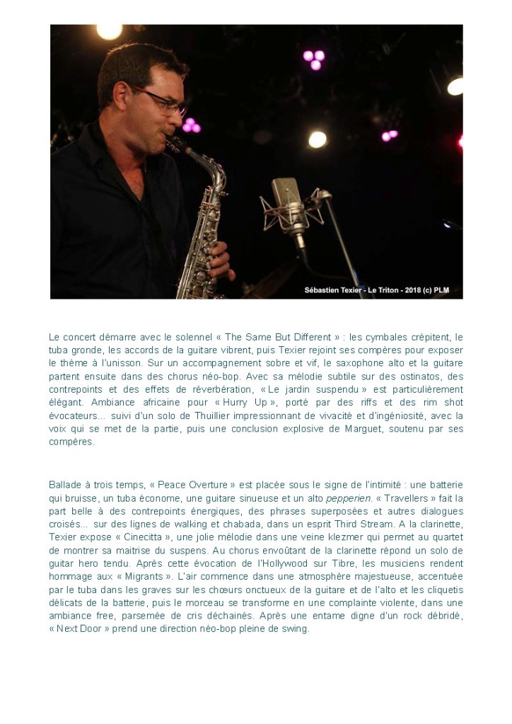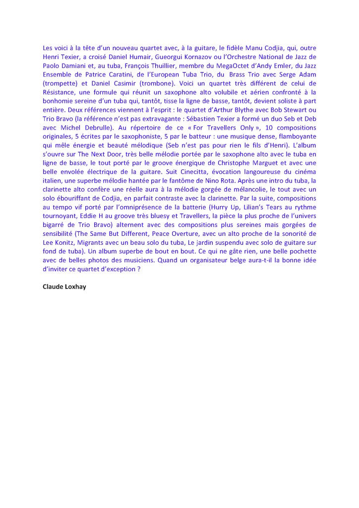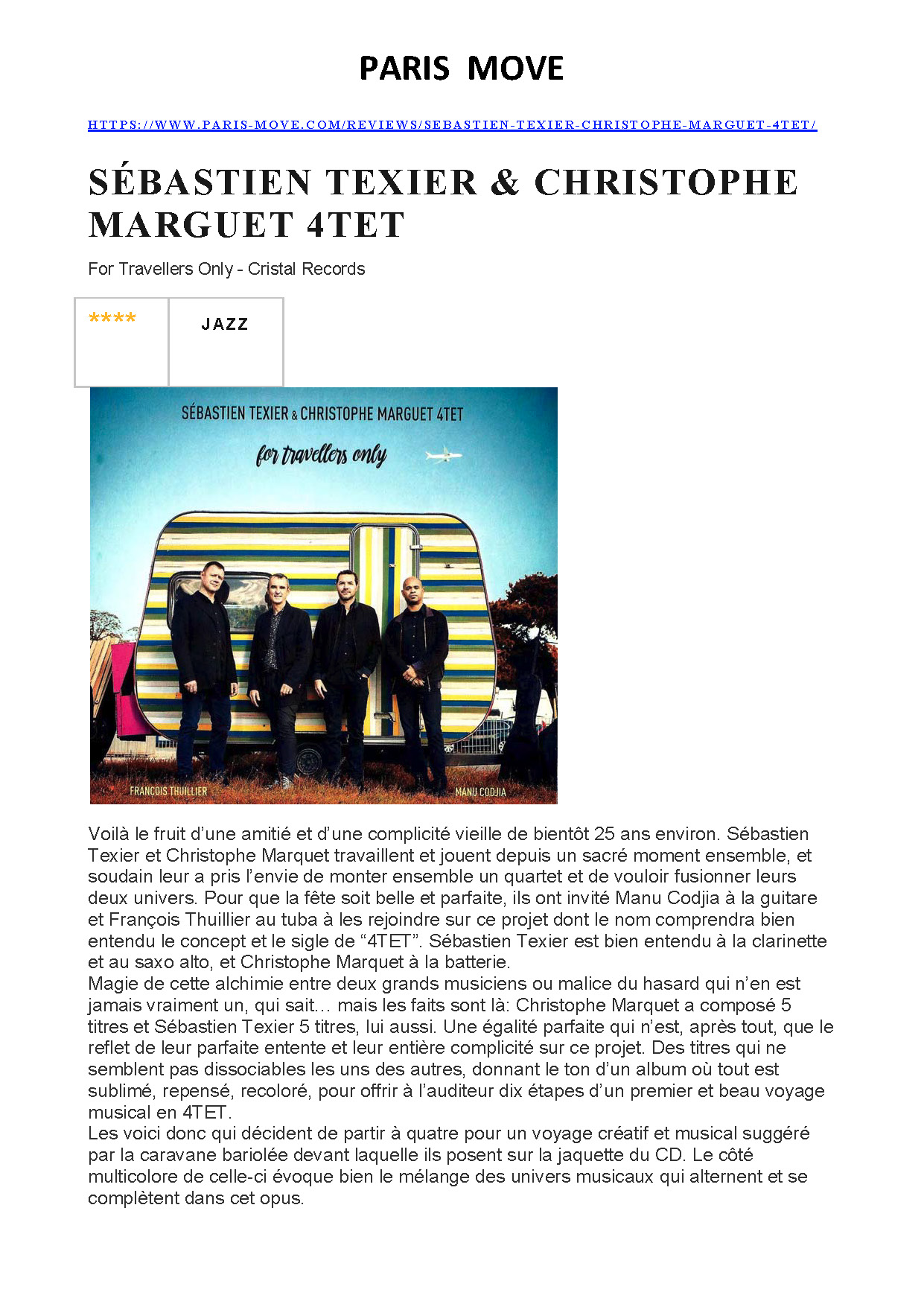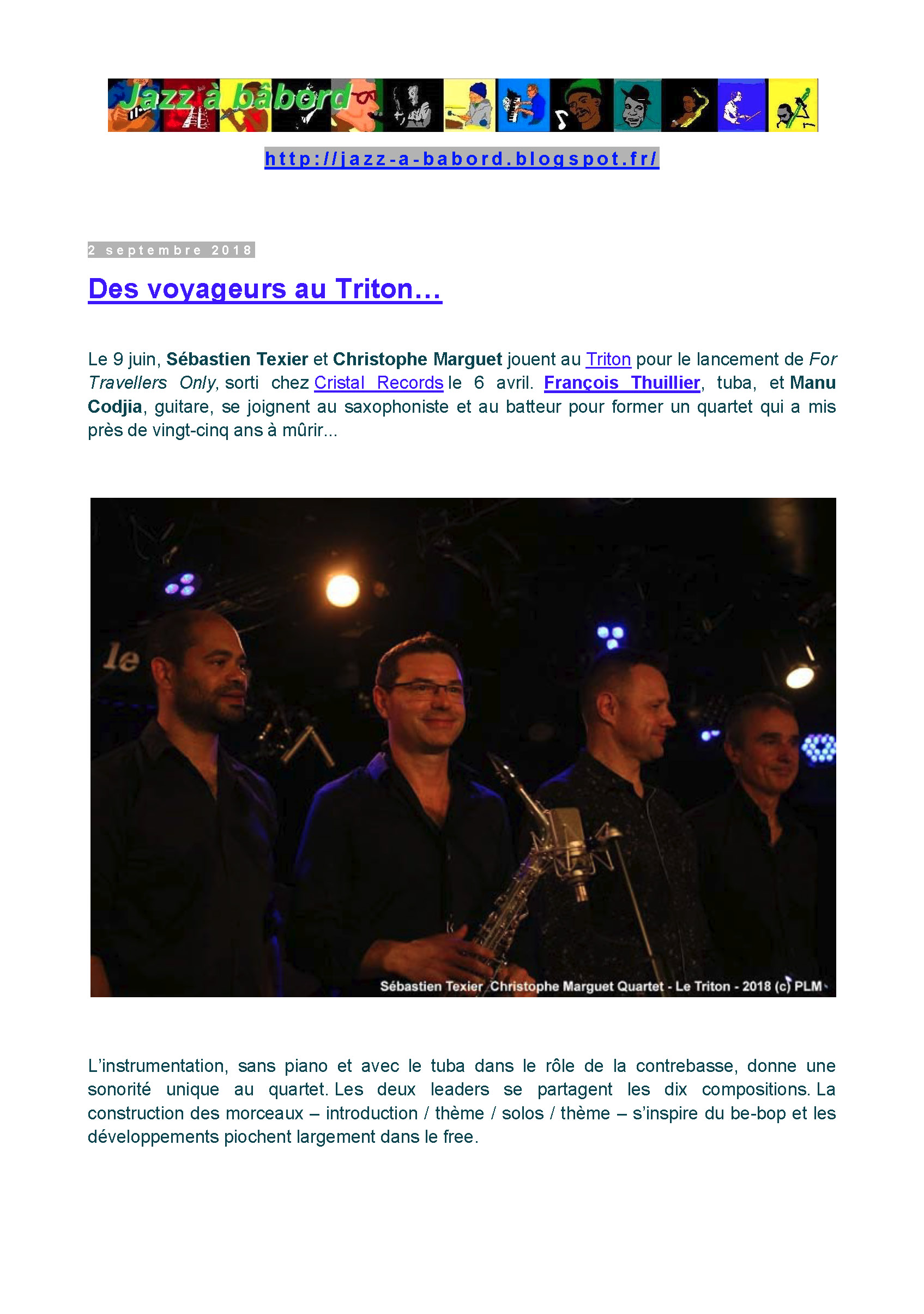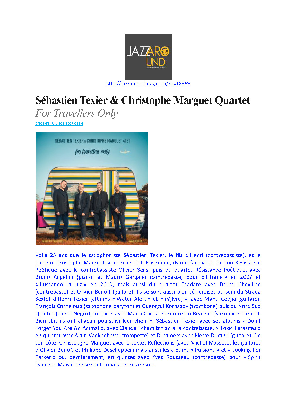 Sébastien Texier : Clarinettes, saxophone alto, compositions Manu Codjia : Guitare François Thuillier : Tuba Christophe Marguet : Batterie, compositions