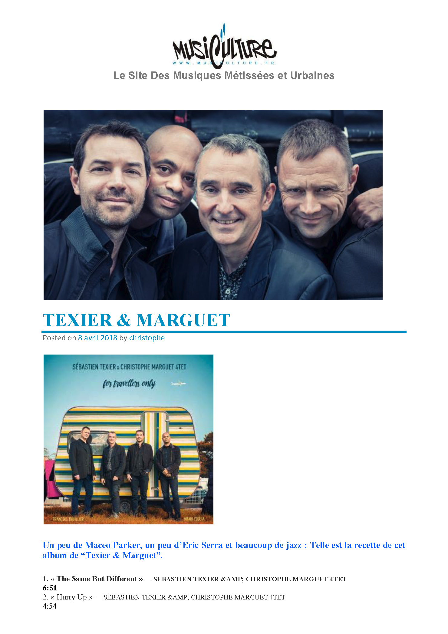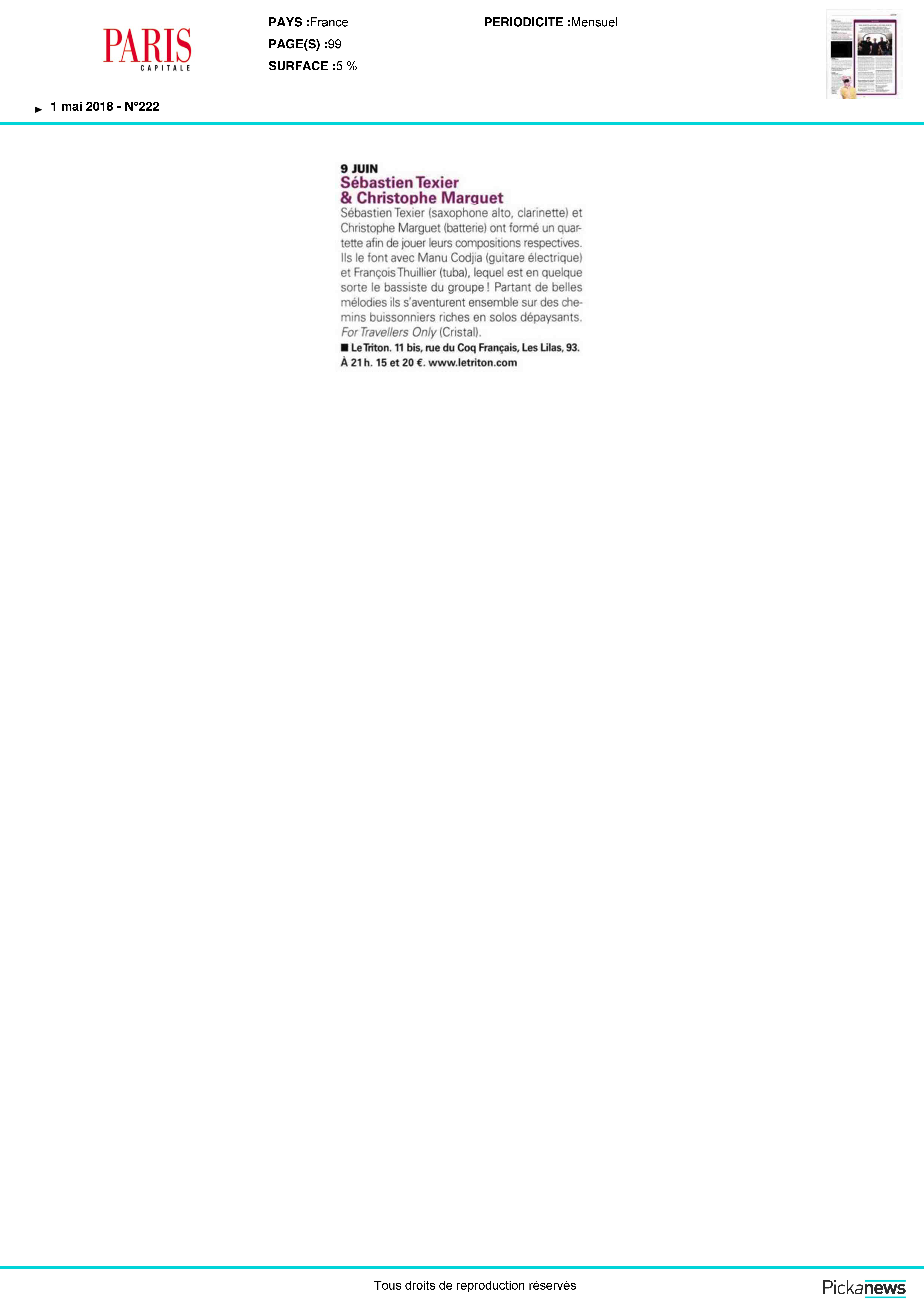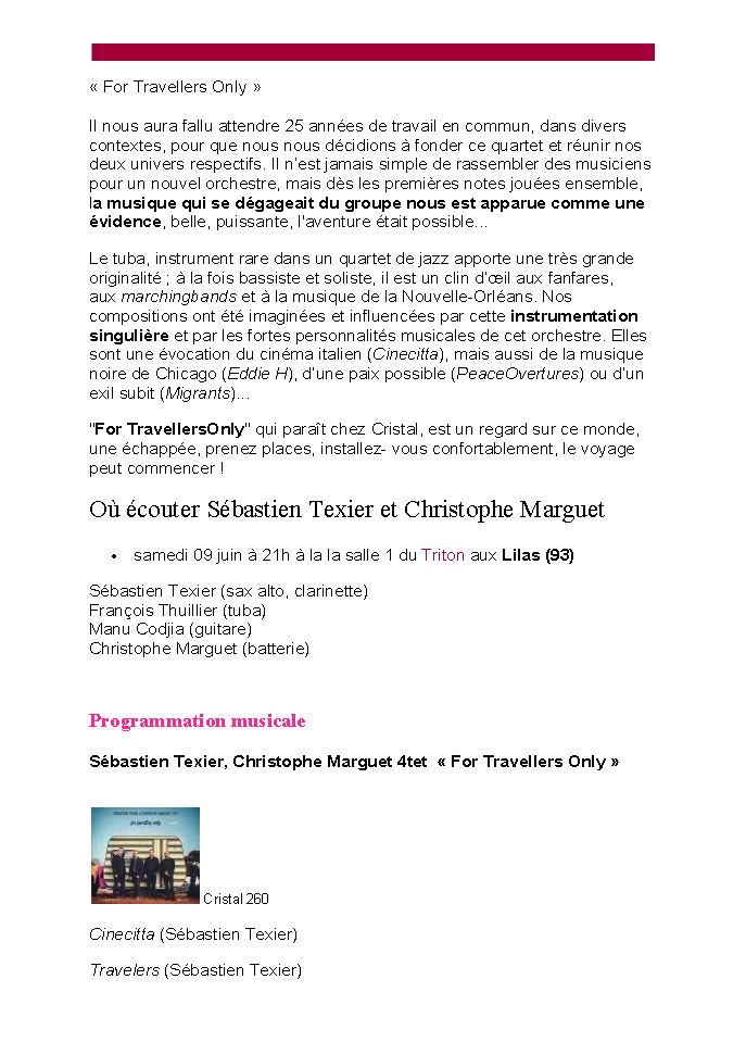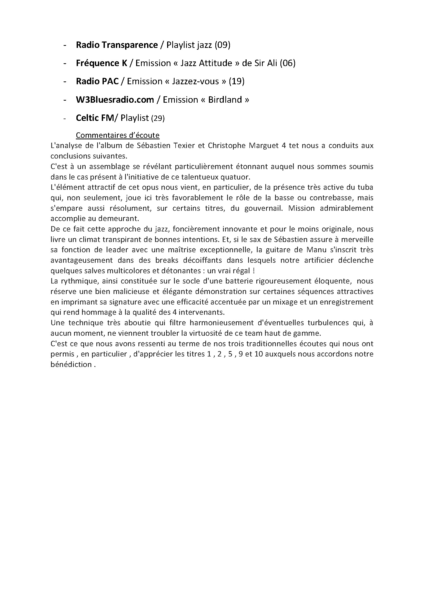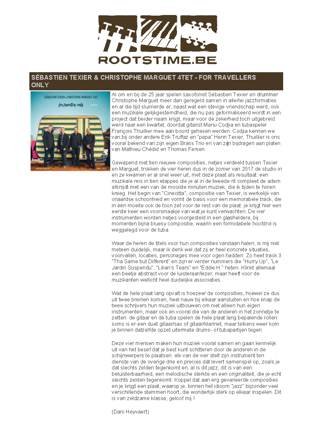 Sébastien Texier : Clarinettes, saxophone alto, compositions Manu Codjia : Guitare François Thuillier : Tuba Christophe Marguet : Batterie, compositions