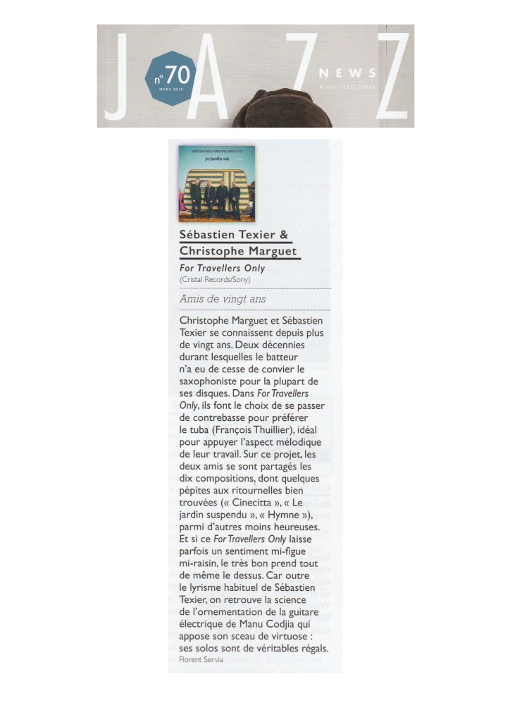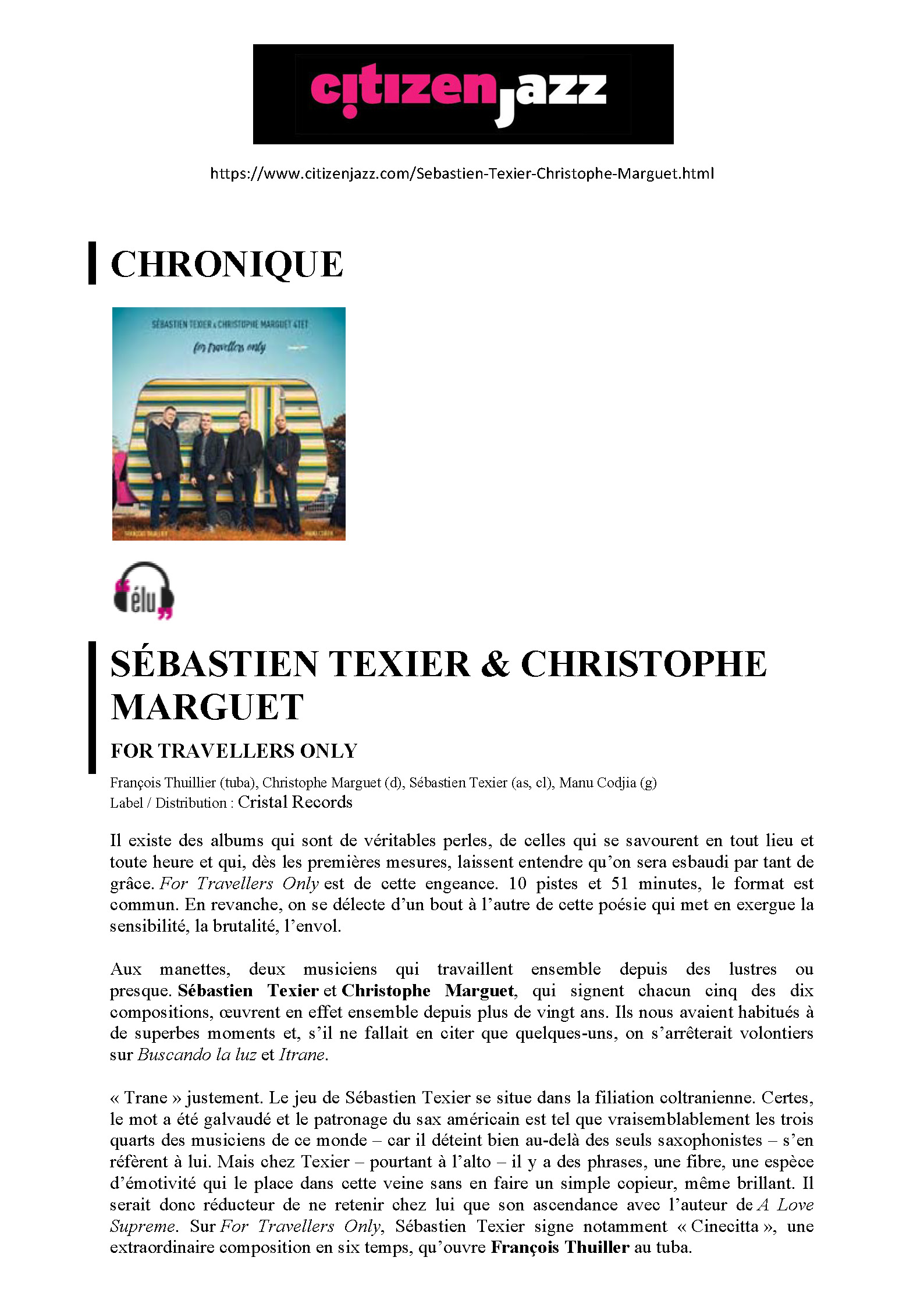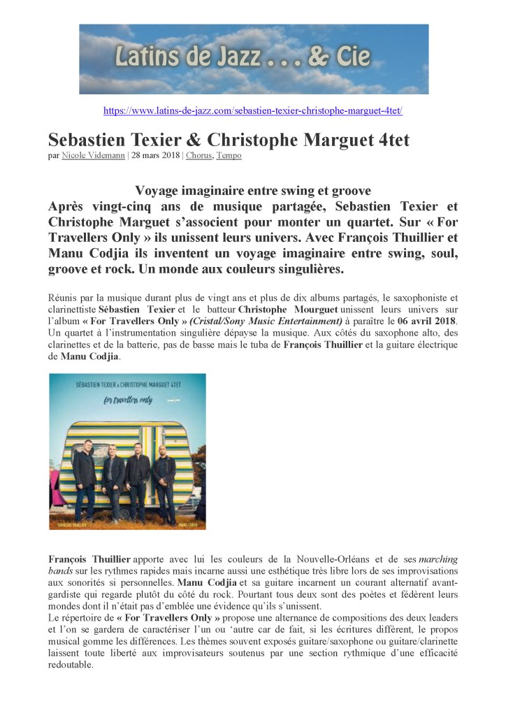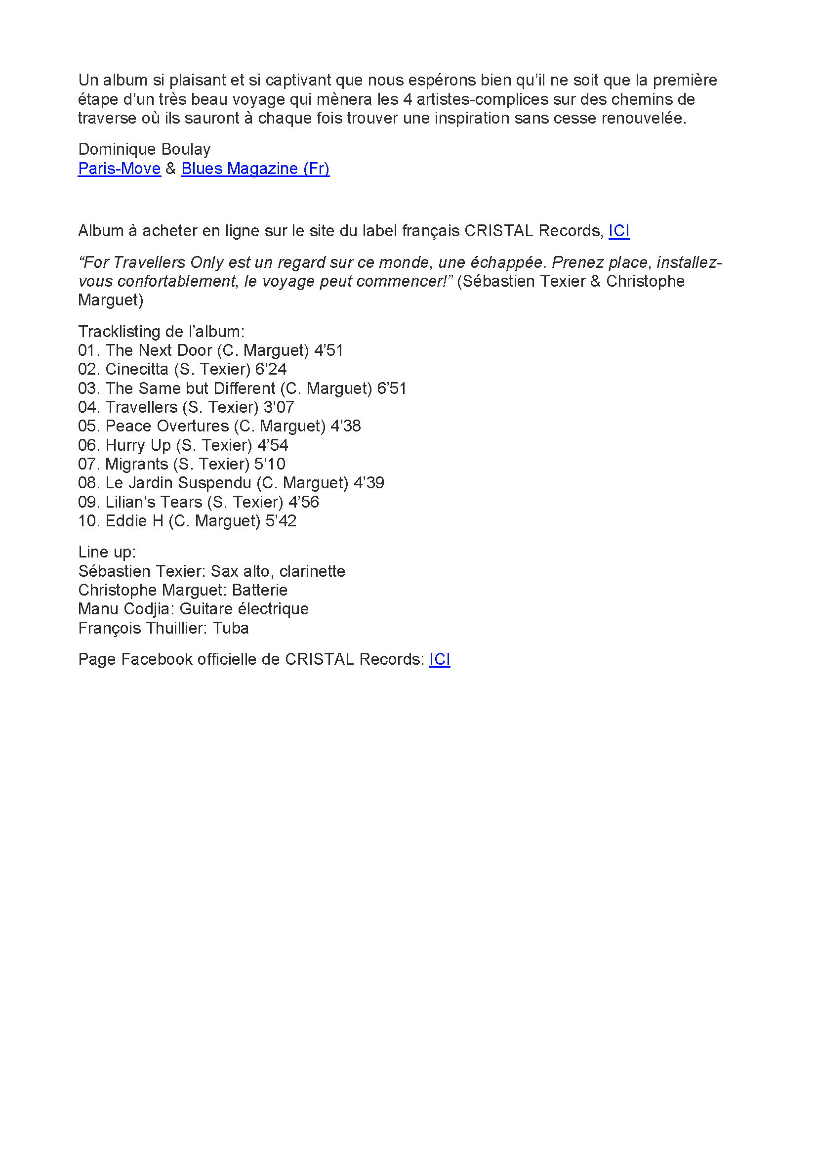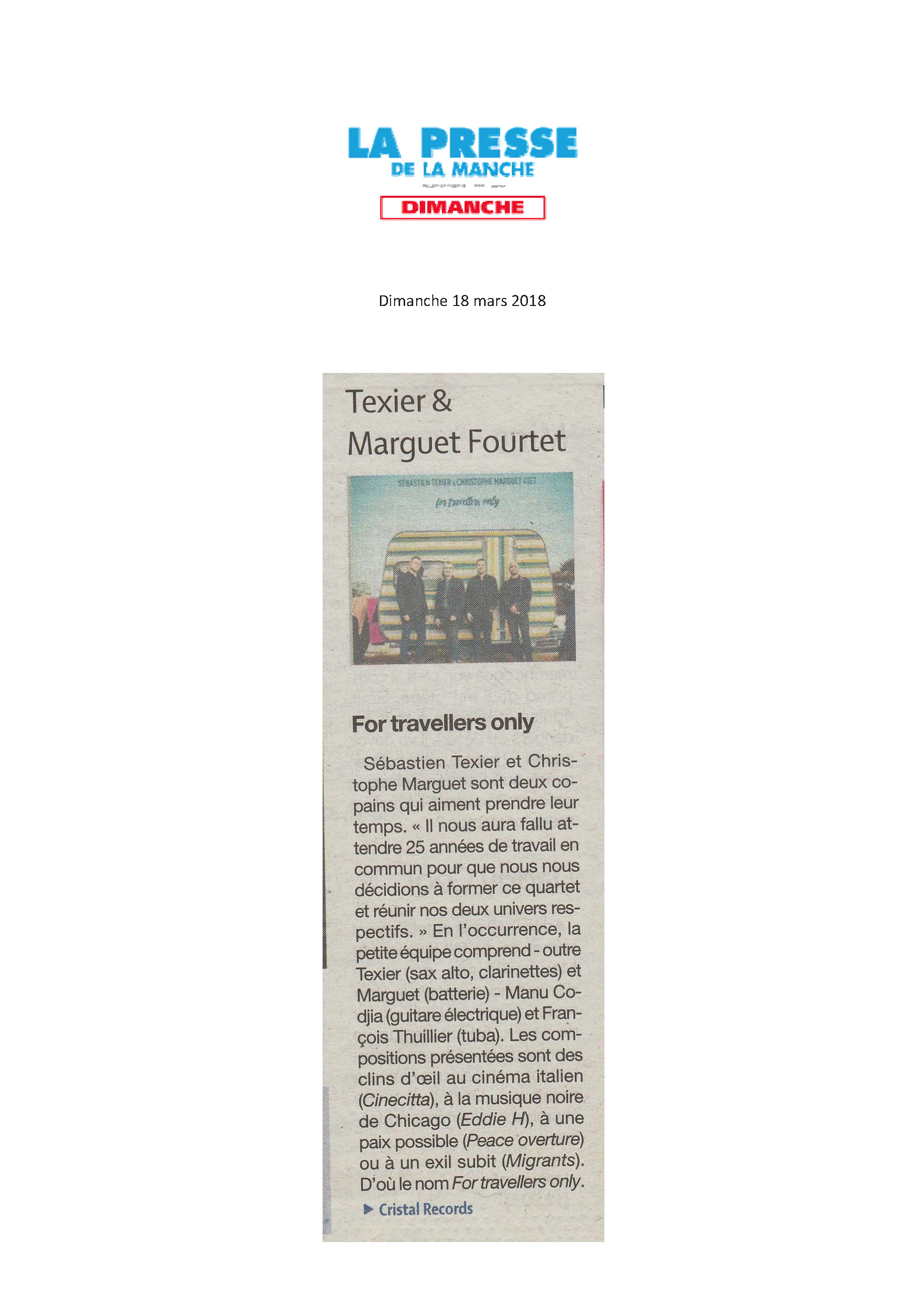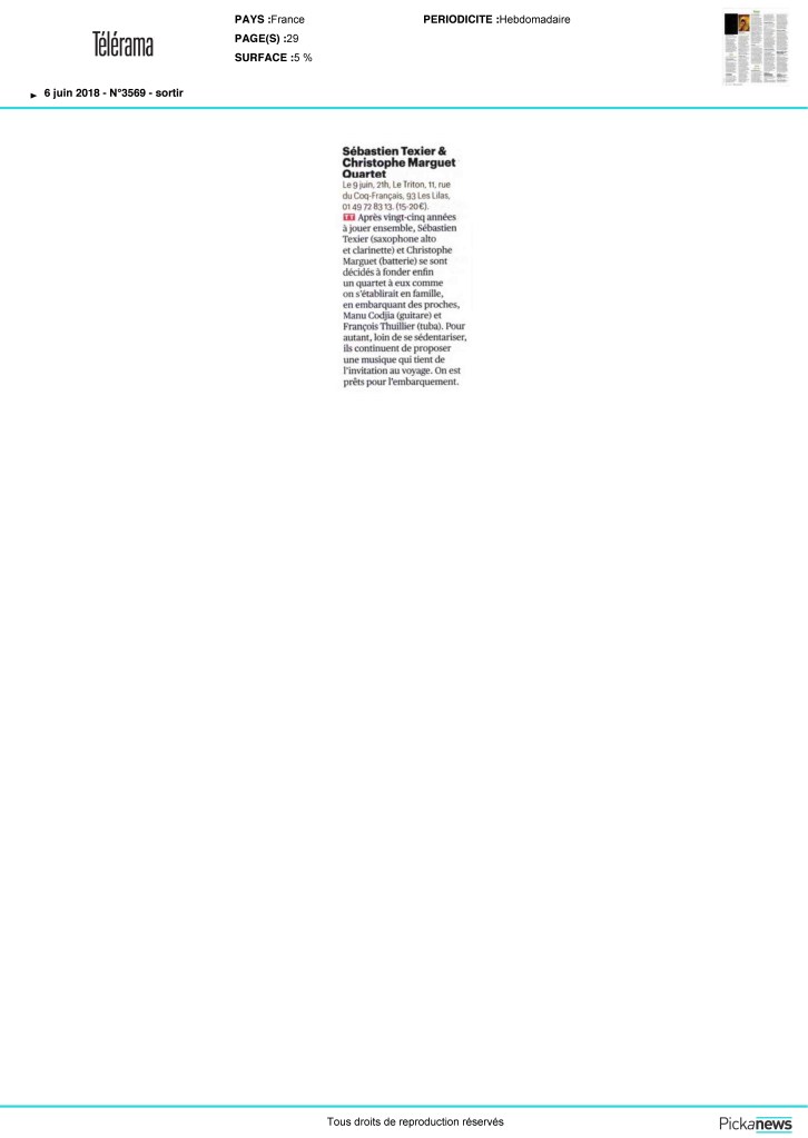 Sébastien Texier : Clarinettes, saxophone alto, compositions Manu Codjia : Guitare François Thuillier : Tuba Christophe Marguet : Batterie, compositions