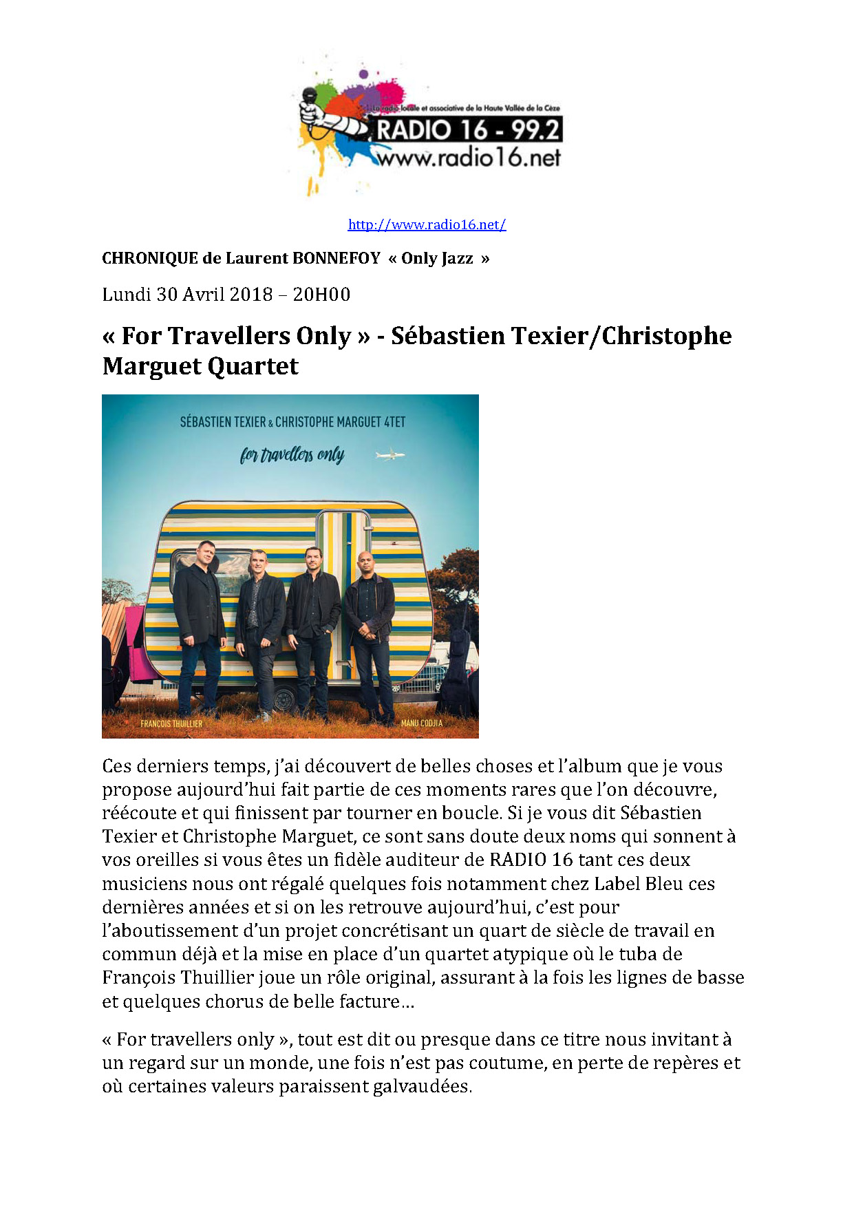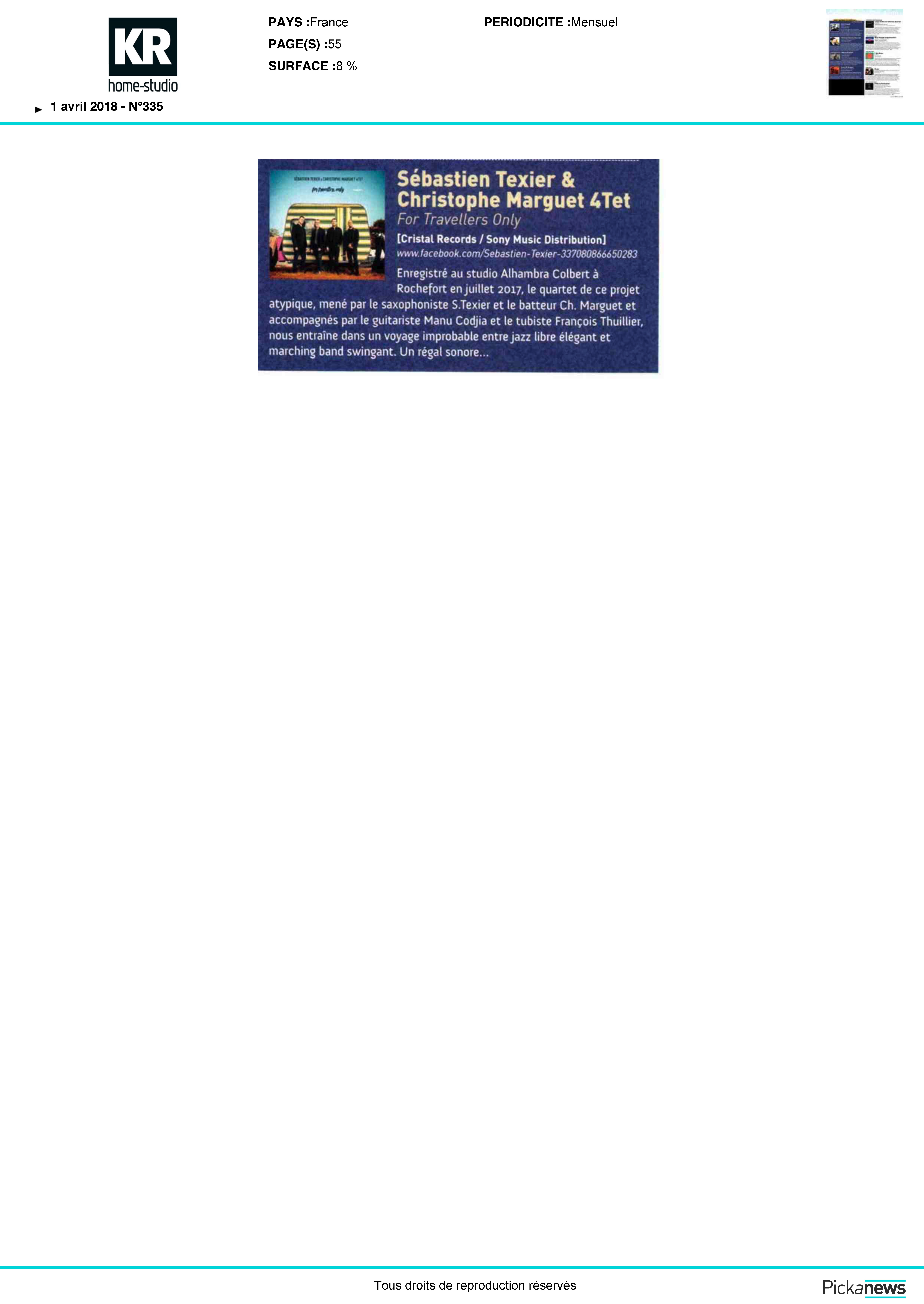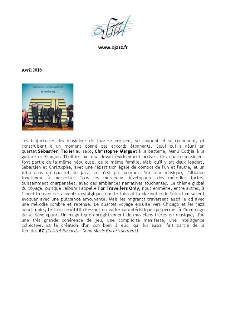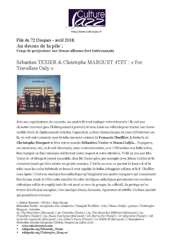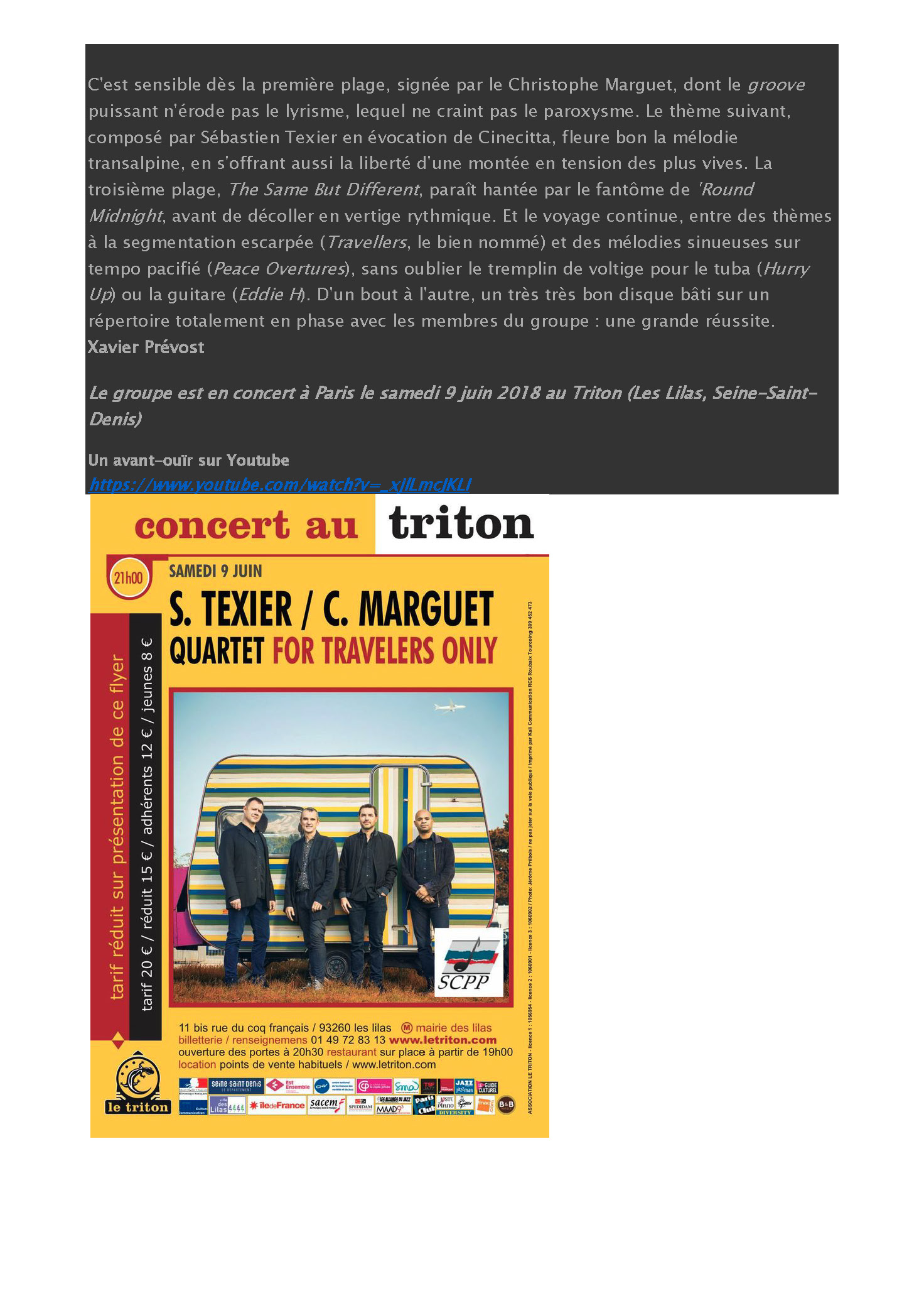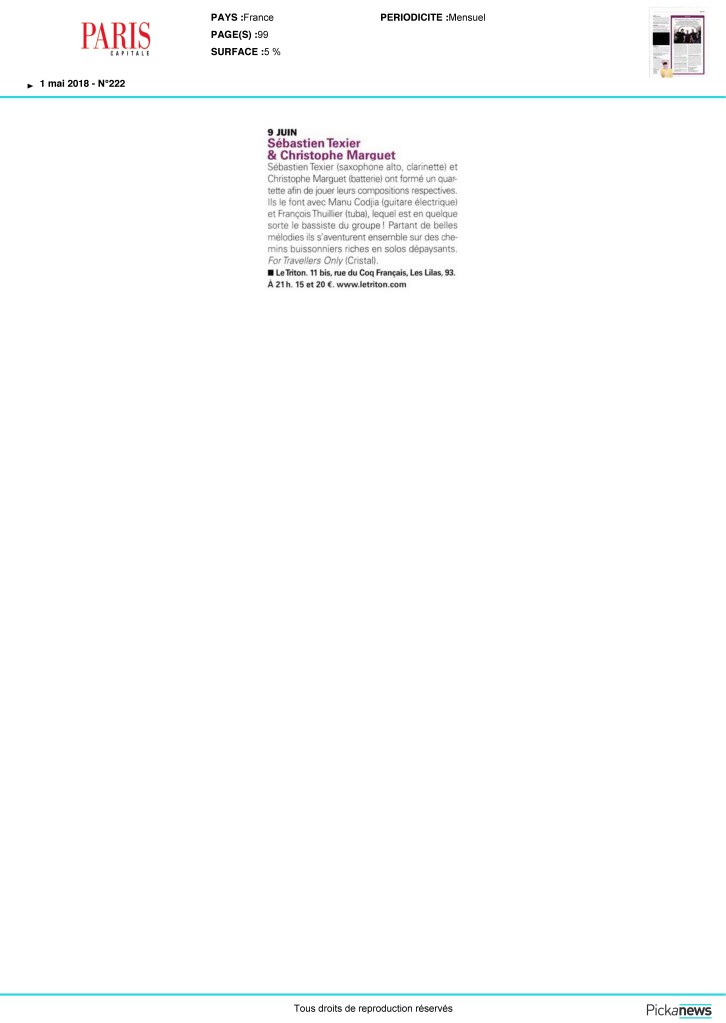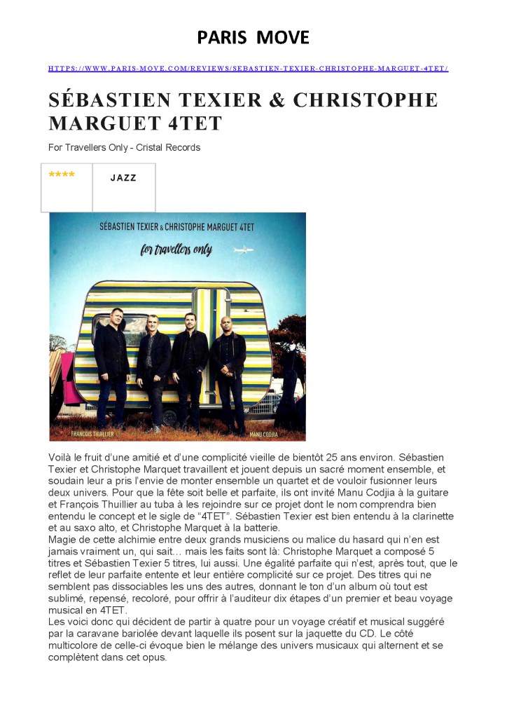 Sébastien Texier : Clarinettes, saxophone alto, compositions Manu Codjia : Guitare François Thuillier : Tuba Christophe Marguet : Batterie, compositions