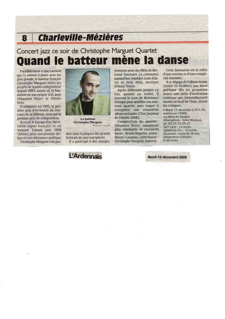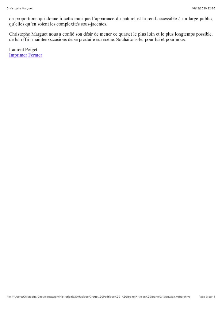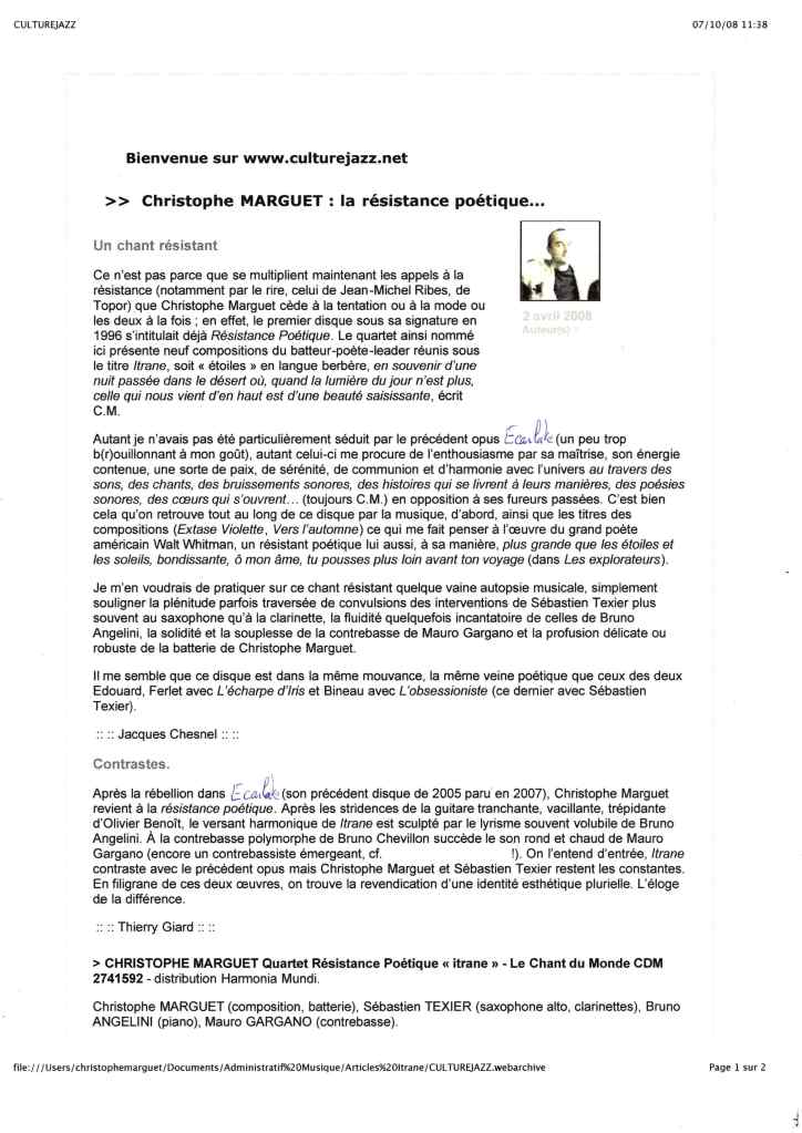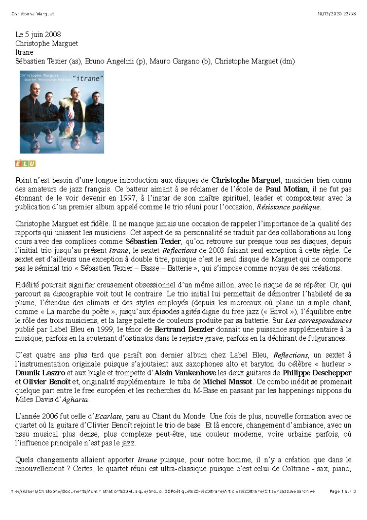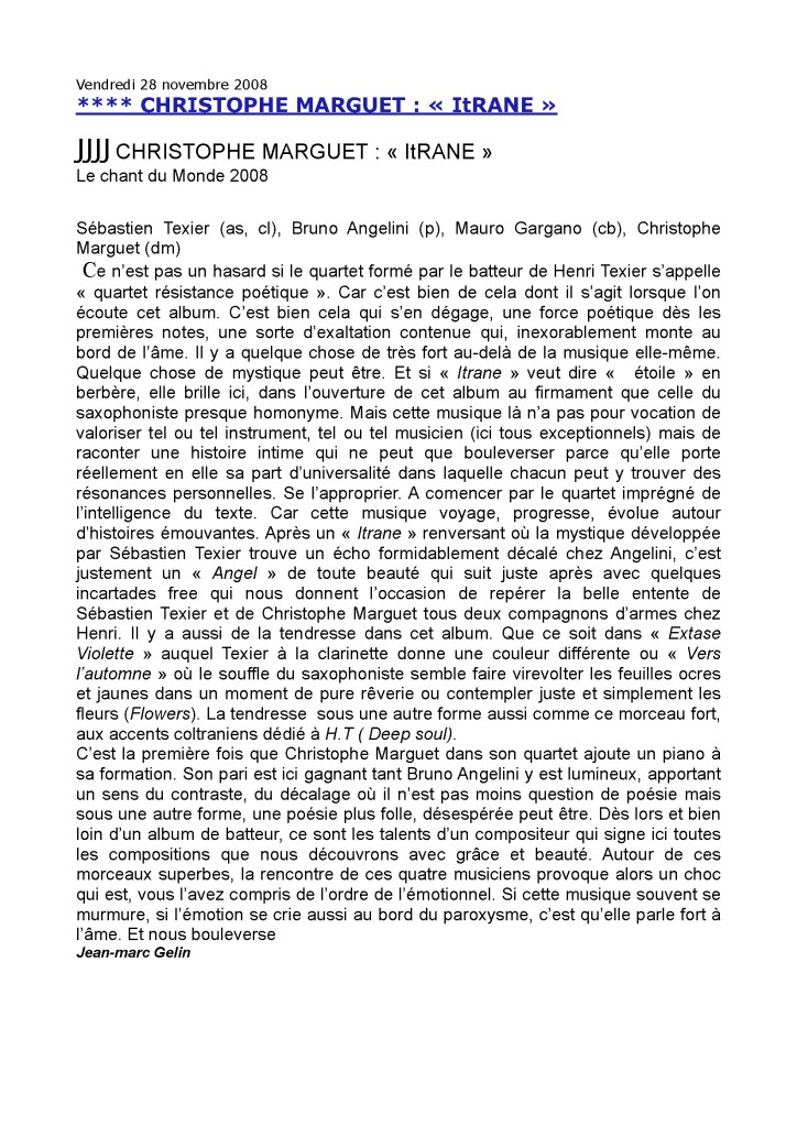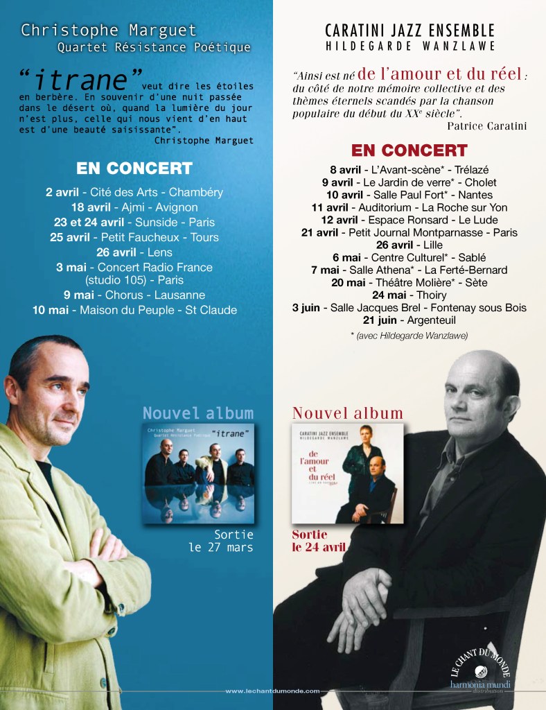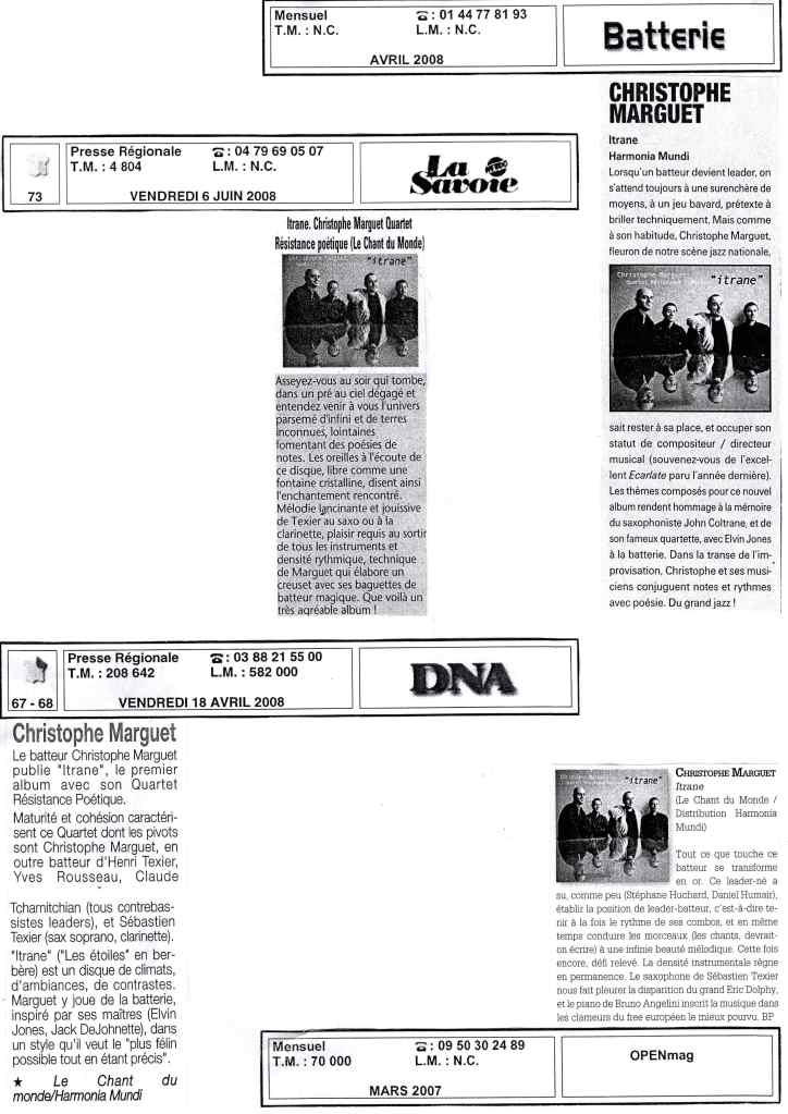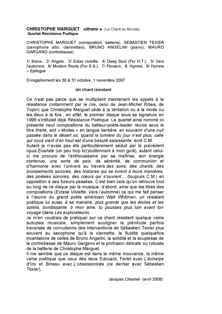 Sébastien Texier : Clarinettes, saxophone alto Bruno Angelini : Piano Mauro Gargano : Contrebasse Christophe Marguet : Batterie, compositions Enregistré les 30,31 octobre et 1er novembre 2007 au Studio Sequenza à Montreuil (93), mixé, masterisé au Studio Boxson à Paris (75) par Philippe Teissier du Cros Le Chant du Monde