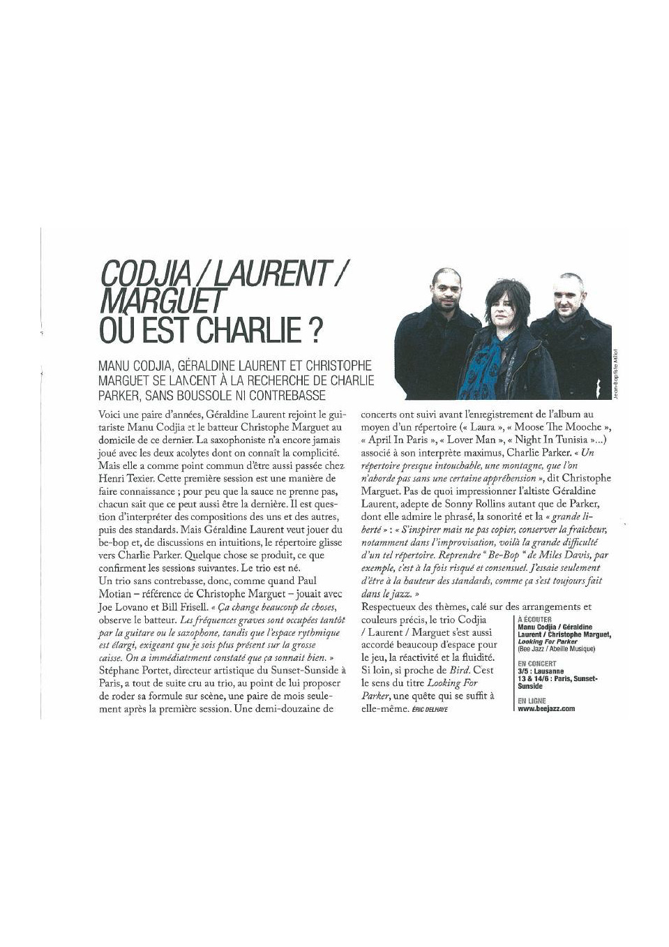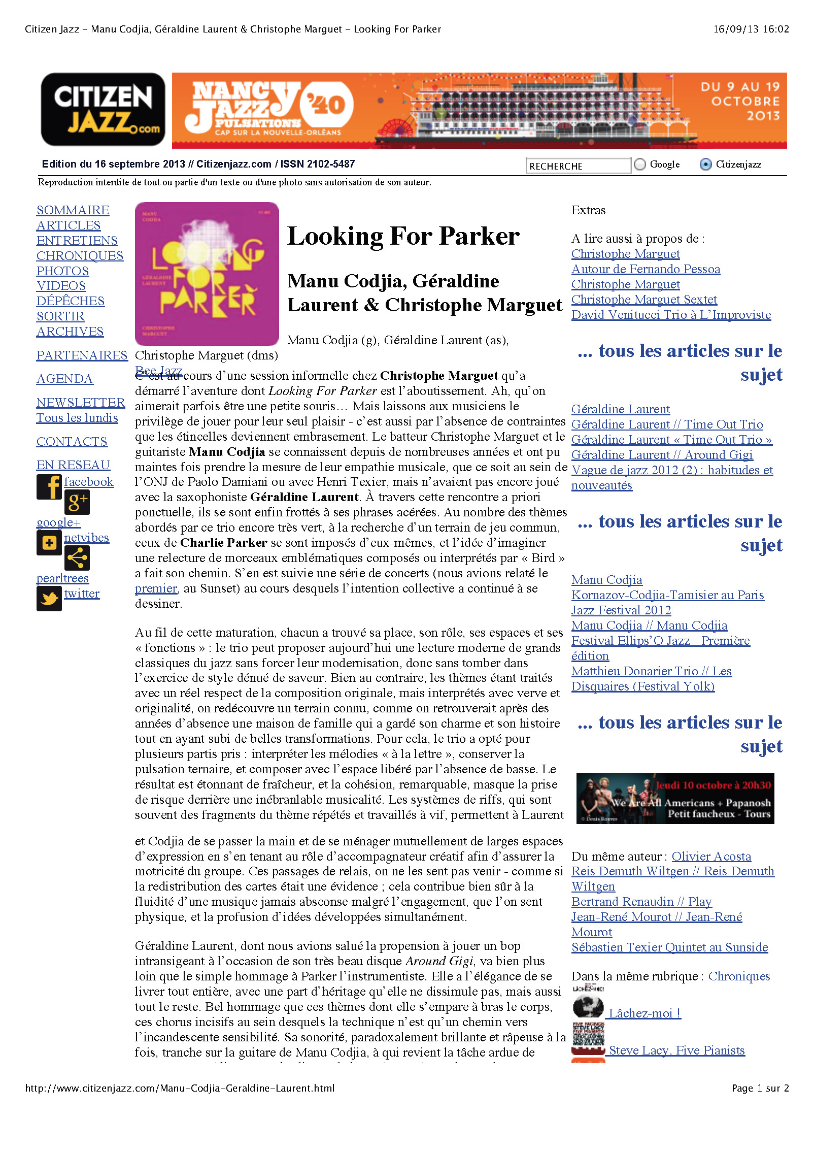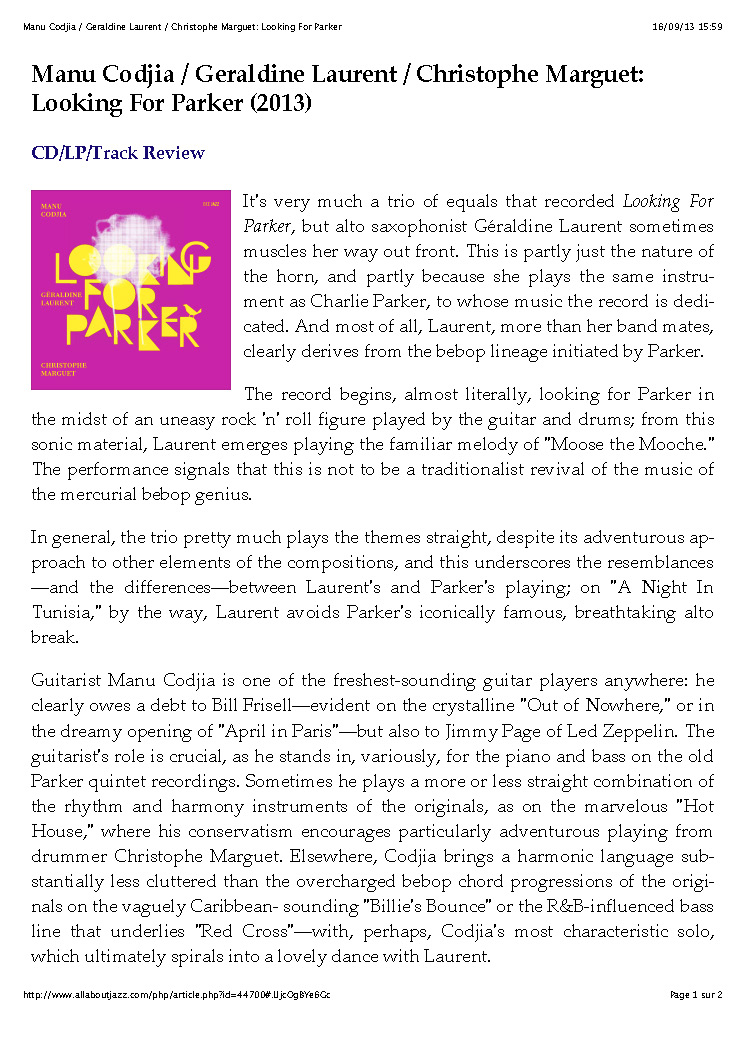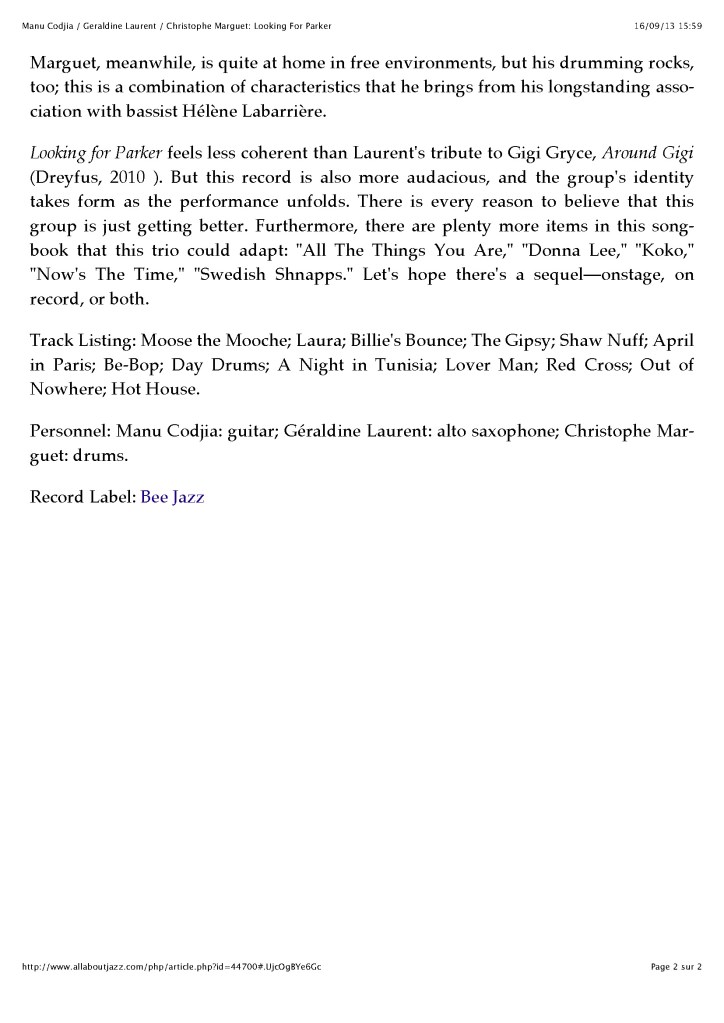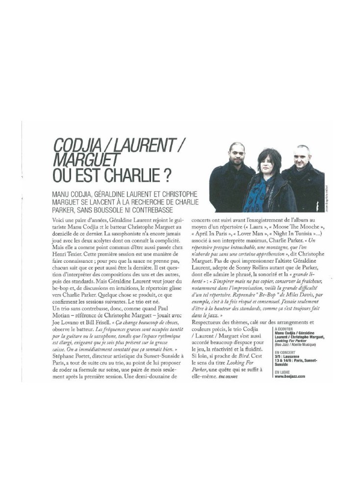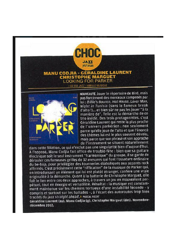 Looking For Parker Looking For PARKER Géraldine Laurent : Saxophone alto Manu Codjia : Guitare Christophe Marguet : Batterie Enregistré en novembre 2012 au Studio Mercredi9 (75) et mixé en décembre 2012 par Boris Darley. Bee Jazz Facebook Twitter Instagram