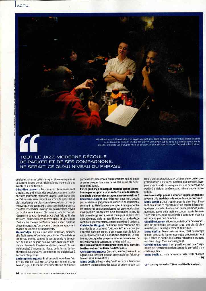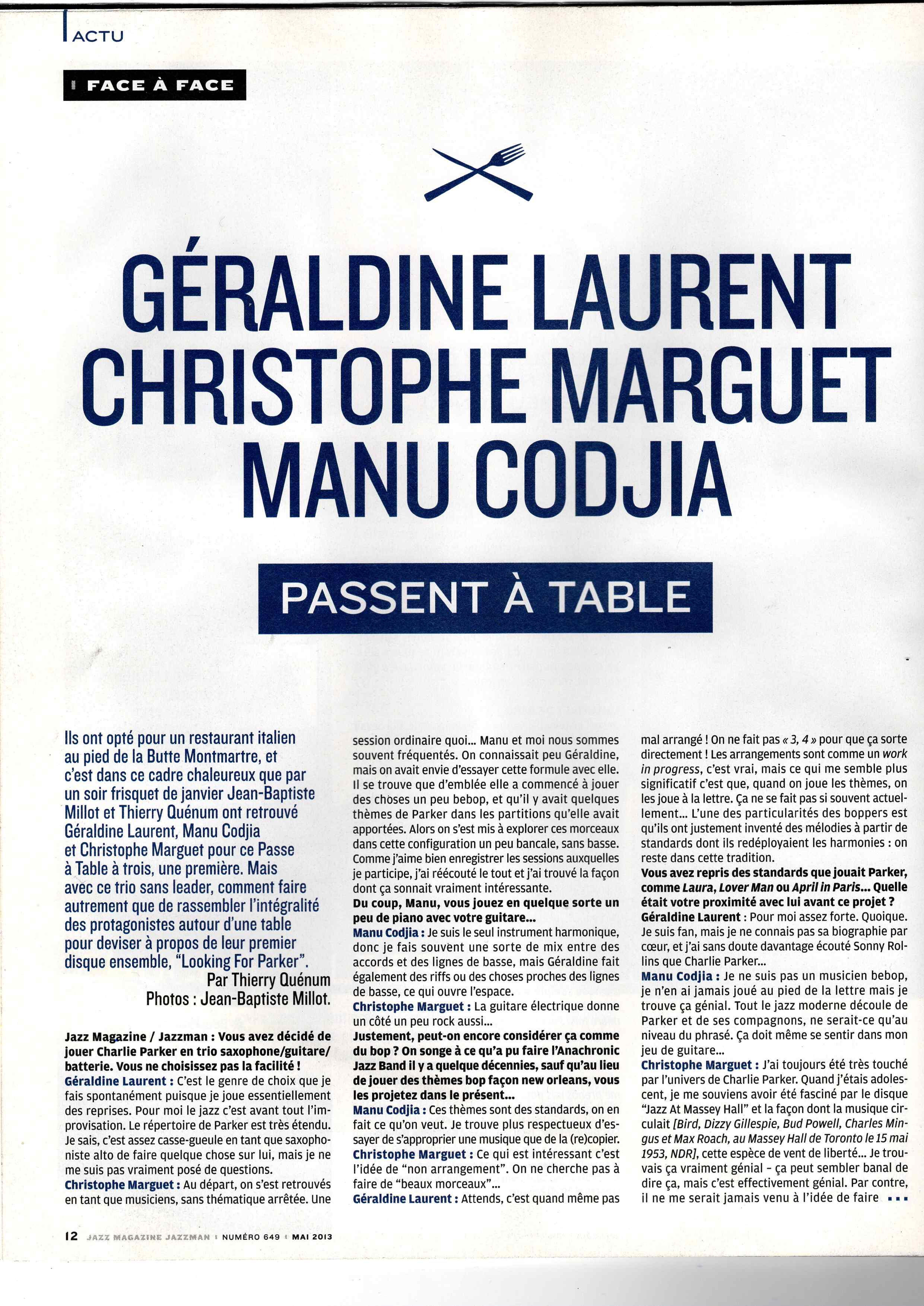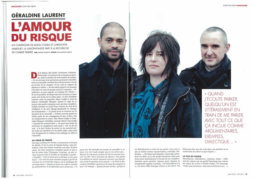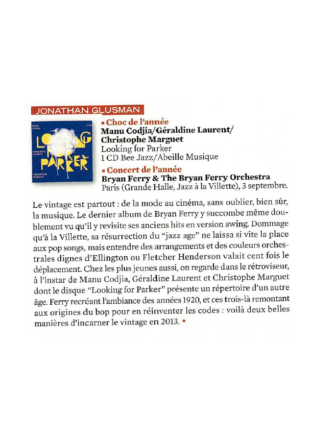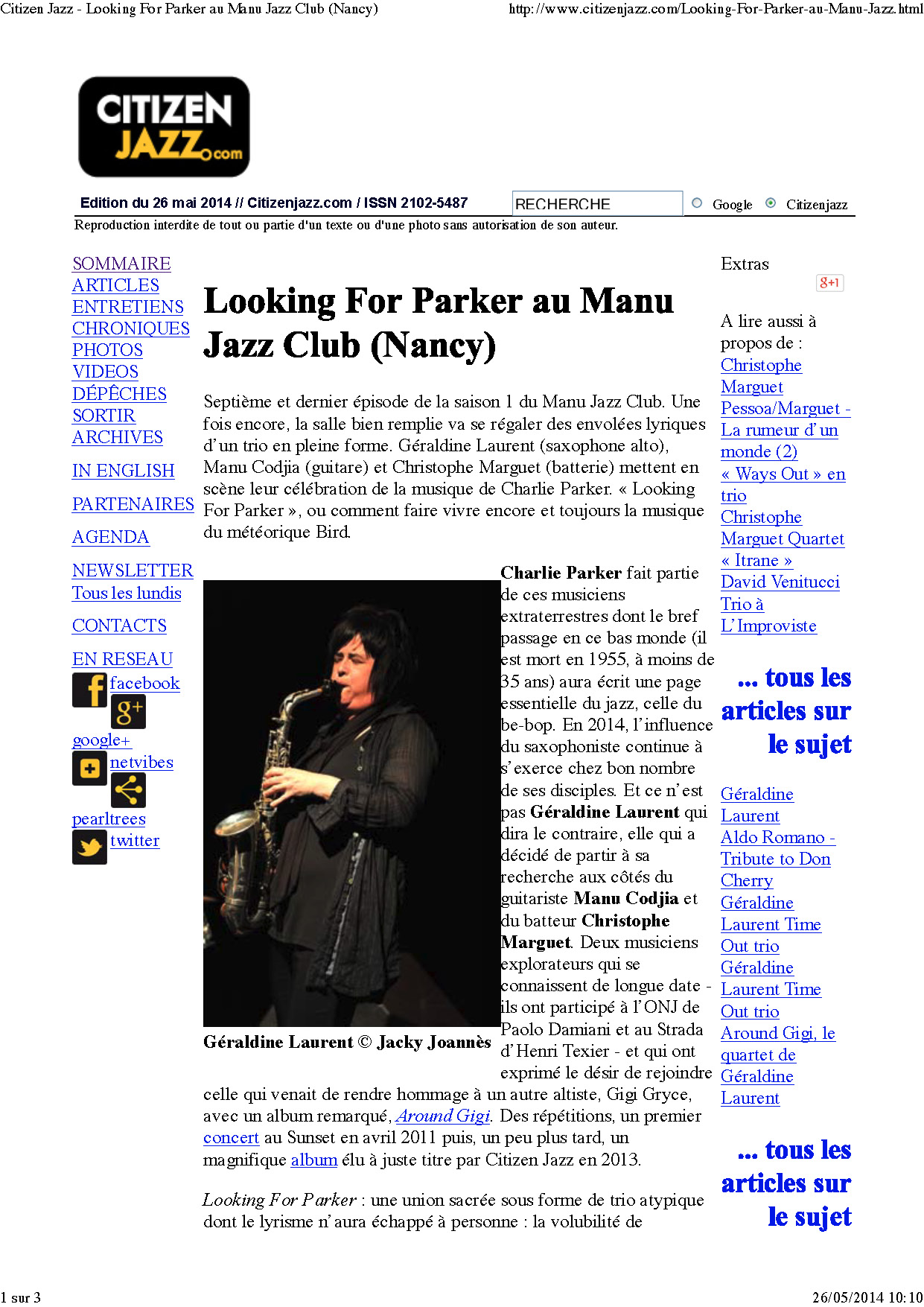 Looking For Parker Looking For PARKER Géraldine Laurent : Saxophone alto Manu Codjia : Guitare Christophe Marguet : Batterie Enregistré en novembre 2012 au Studio Mercredi9 (75) et mixé en décembre 2012 par Boris Darley. Bee Jazz Facebook Twitter Instagram