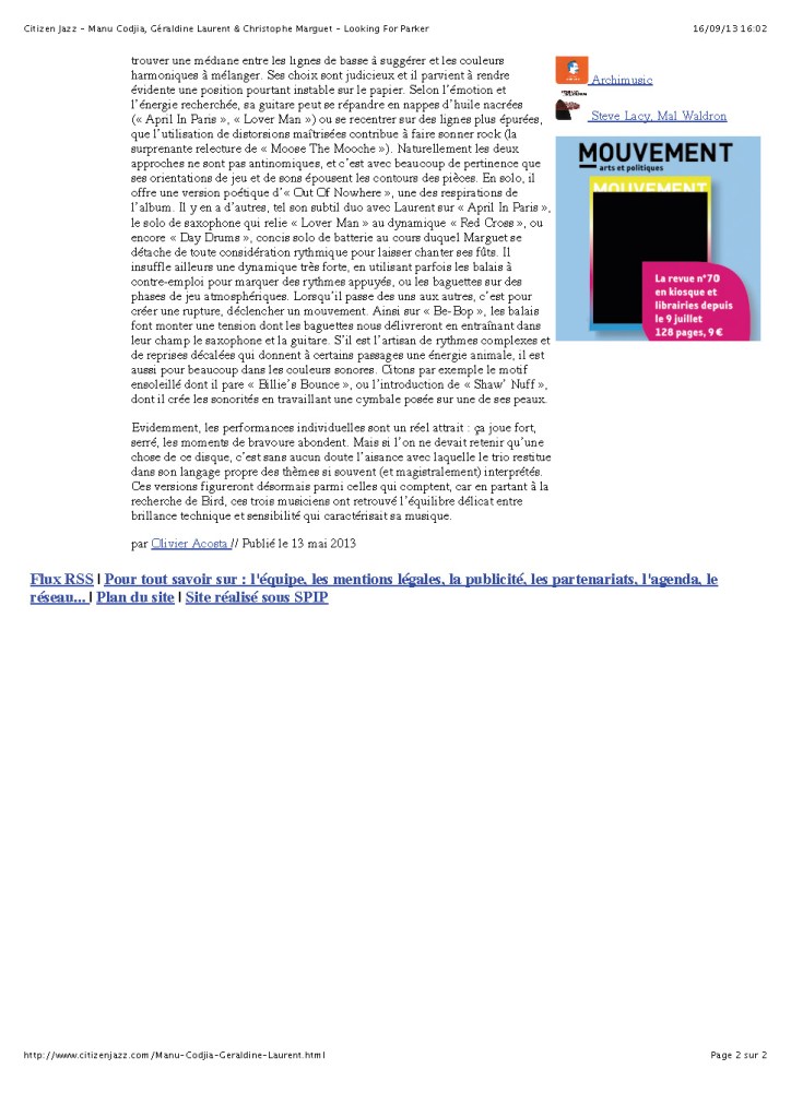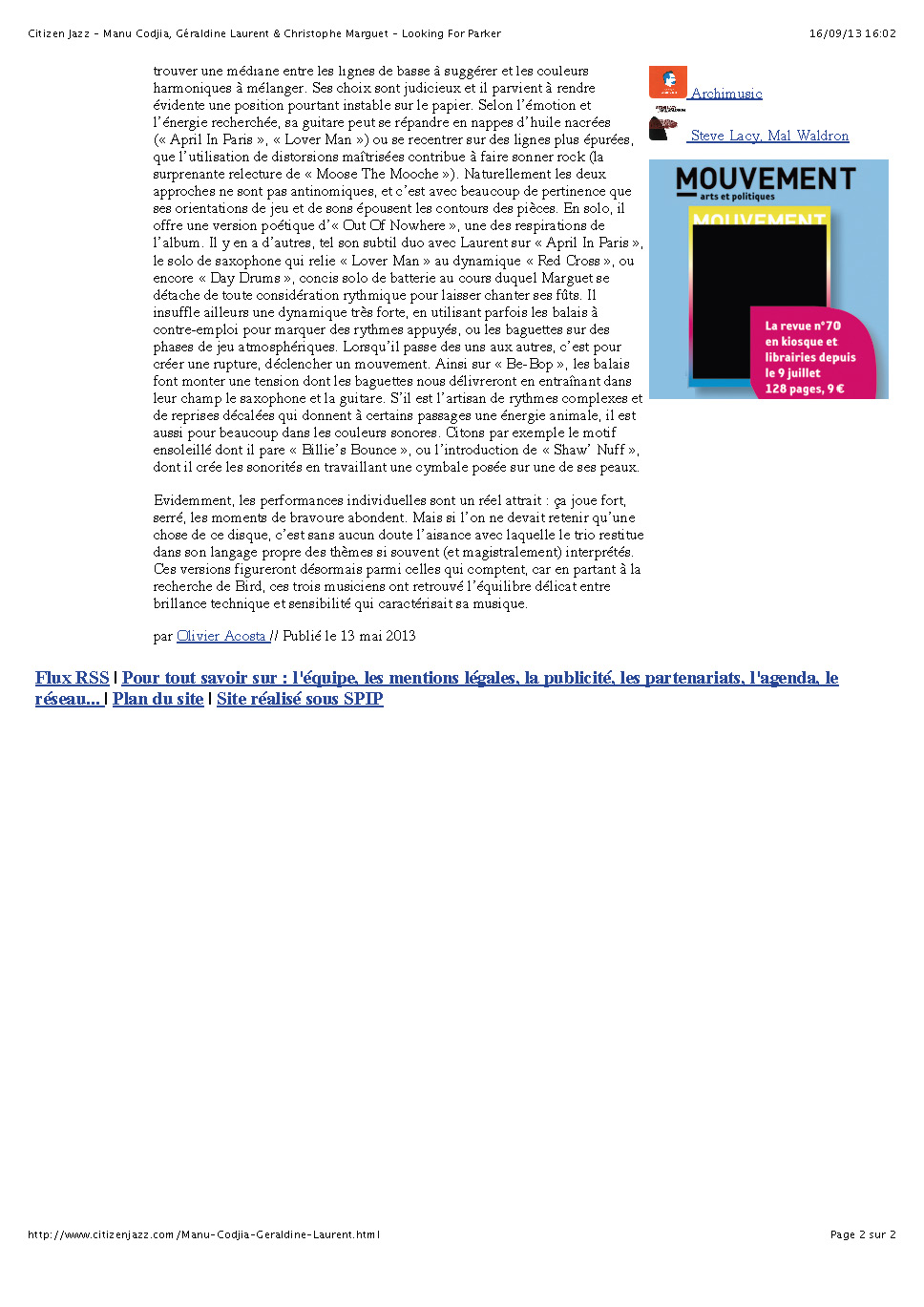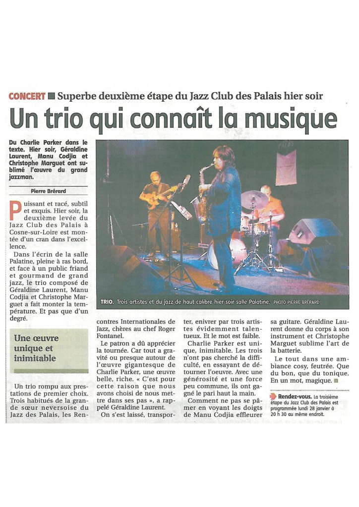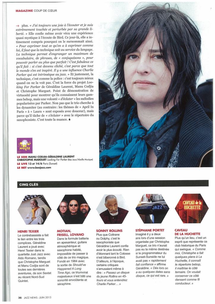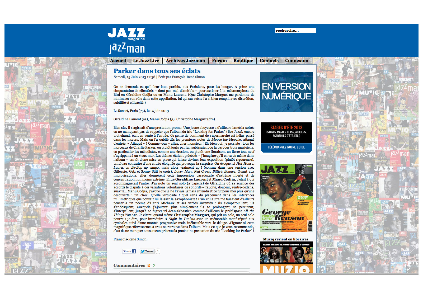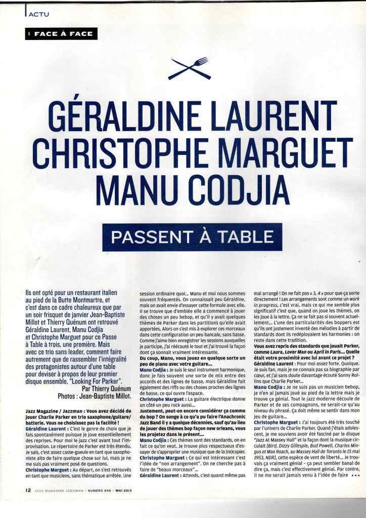 Looking For Parker Looking For PARKER Géraldine Laurent : Saxophone alto Manu Codjia : Guitare Christophe Marguet : Batterie Enregistré en novembre 2012 au Studio Mercredi9 (75) et mixé en décembre 2012 par Boris Darley. Bee Jazz Facebook Twitter Instagram