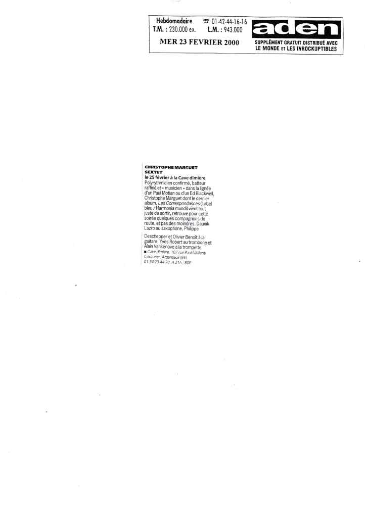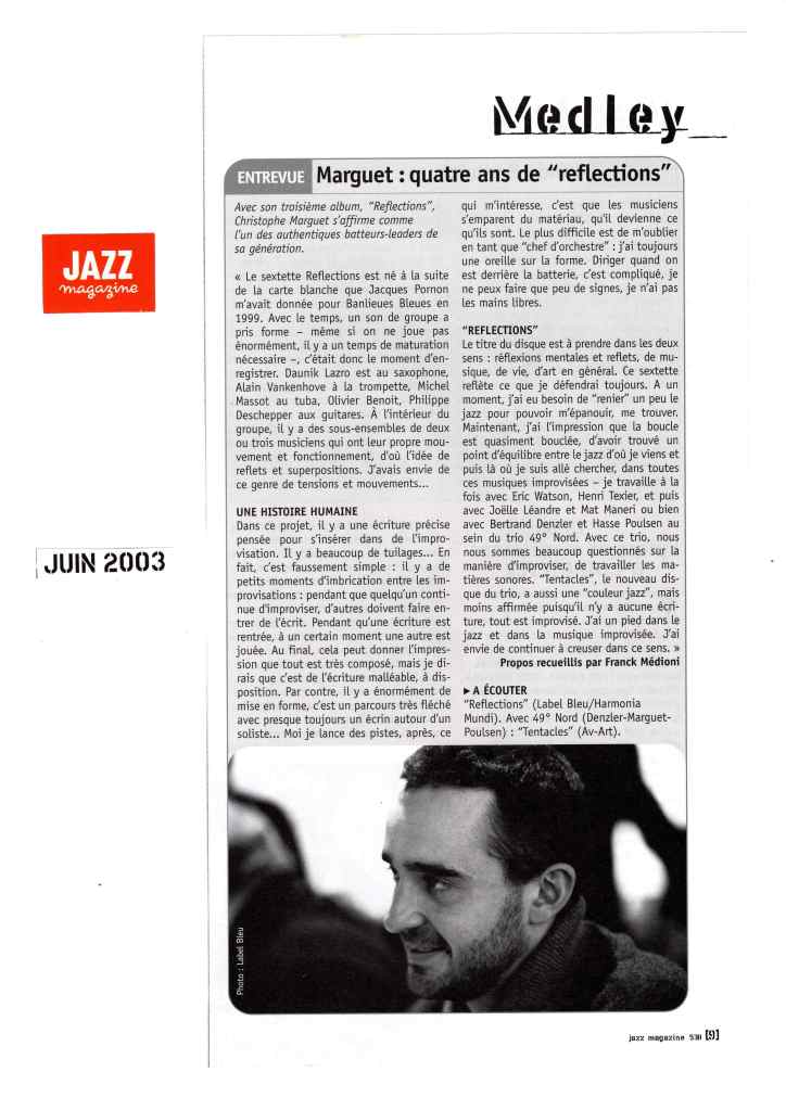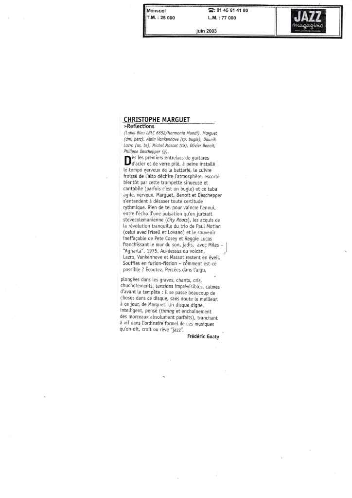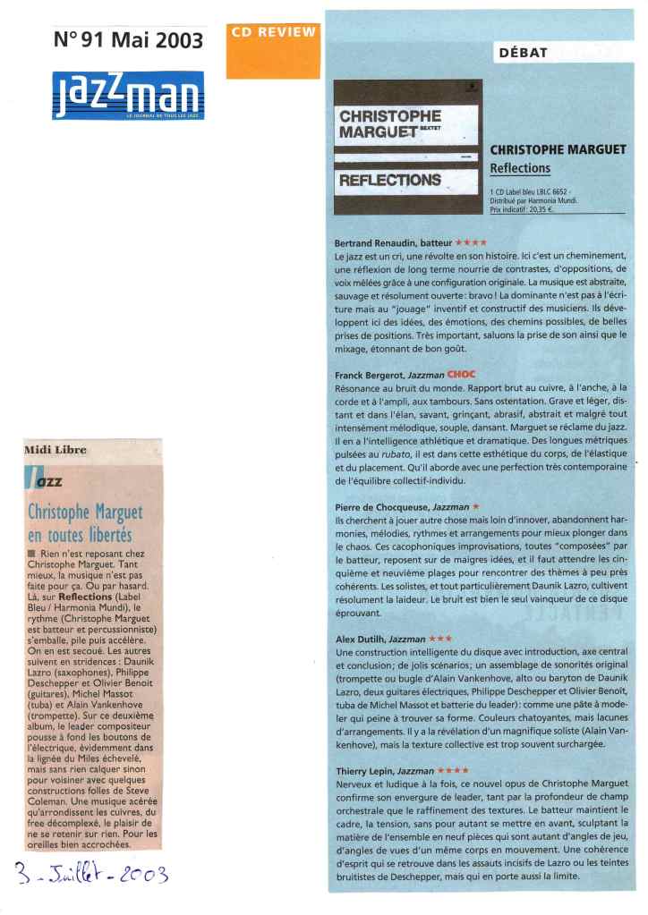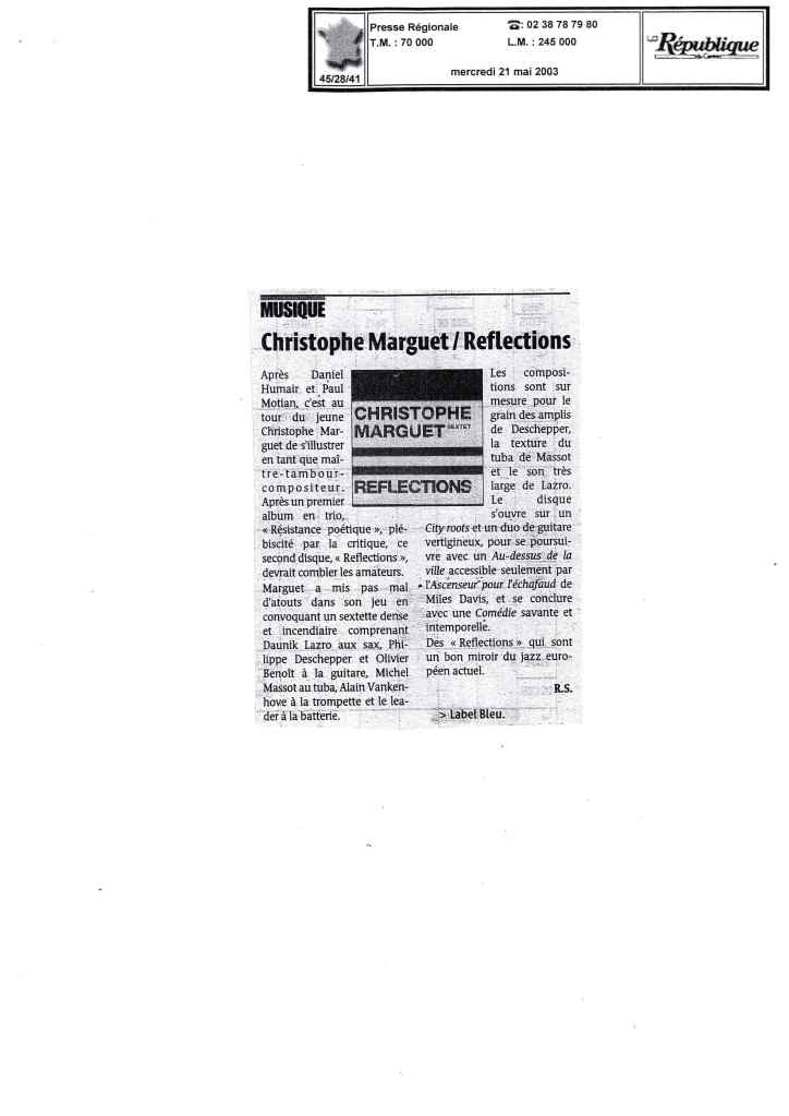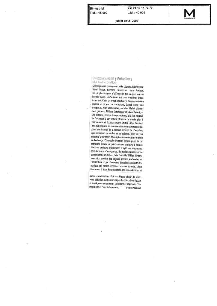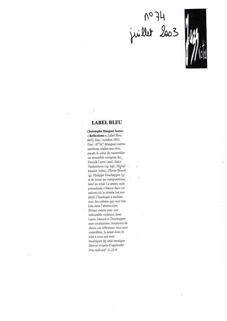 Daunik Lazro : Saxophones alto et baryton Alain Vankenhove : Trompette, bugle Michel Massot : Tuba Olivier Benoit : Guitare Philippe Deschepper : Guitare Christophe Marguet : Batterie, compositions Enregistré les 28,29,30 octobre 2002 au Studio Gil Evans à Amiens (80) et mixé au Studio Boxson à Paris (75) par Philippe Teissier du Cros Label Bleu