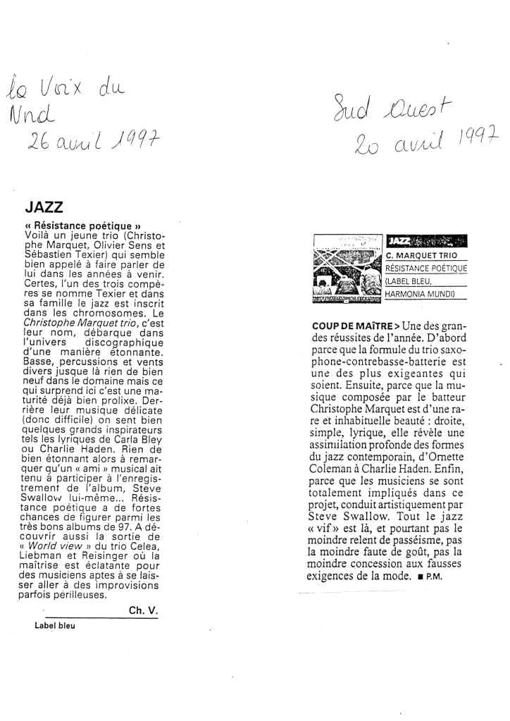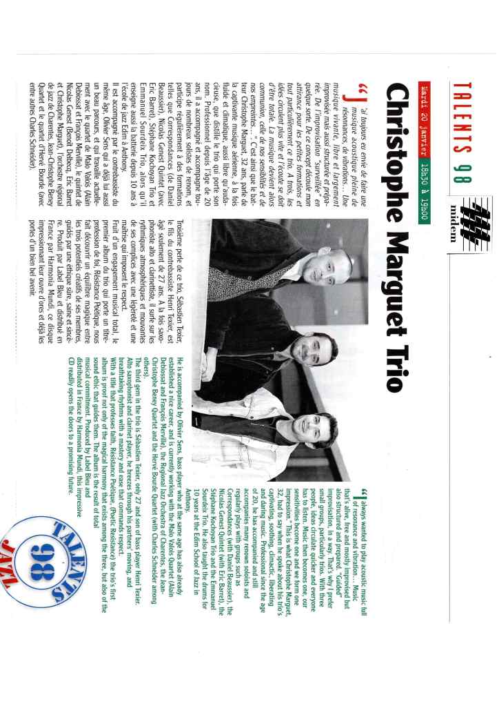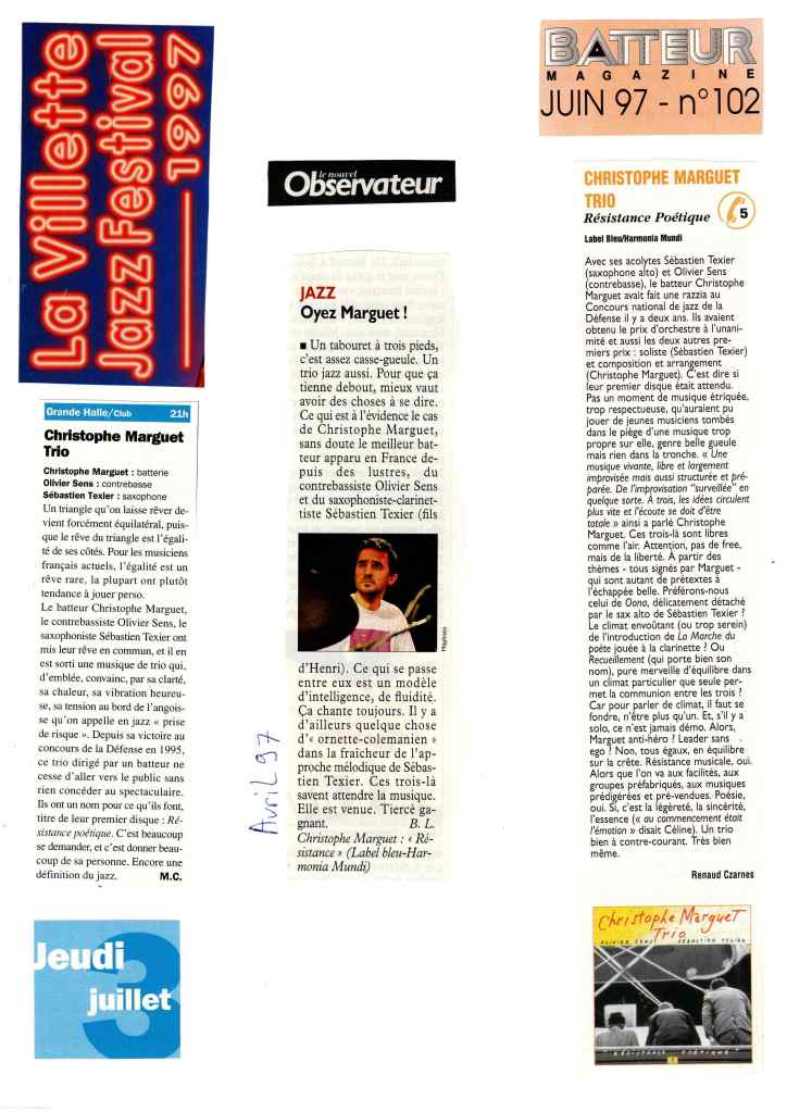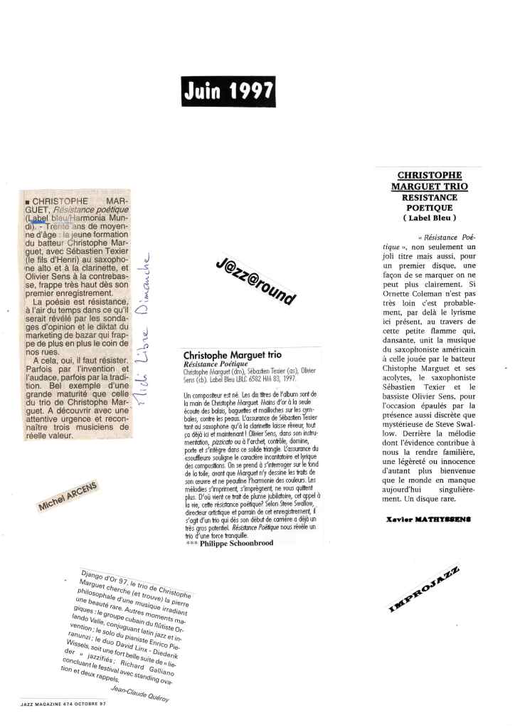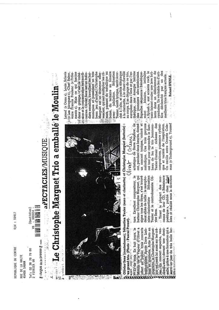 Sébastien Texier : Saxophone alto, clarinette Olivier Sens : Contrebasse Christophe Marguet : Batterie, compositions Steve Swallow : Direction artistique Enregistré et mixé en novembre 1996 par Philippe Teissier du Cros au Studio Gil Evans à Amiens (80) Label Bleu
