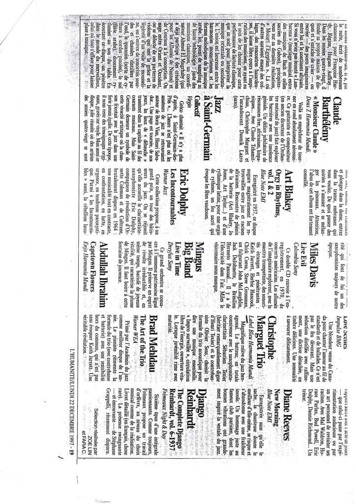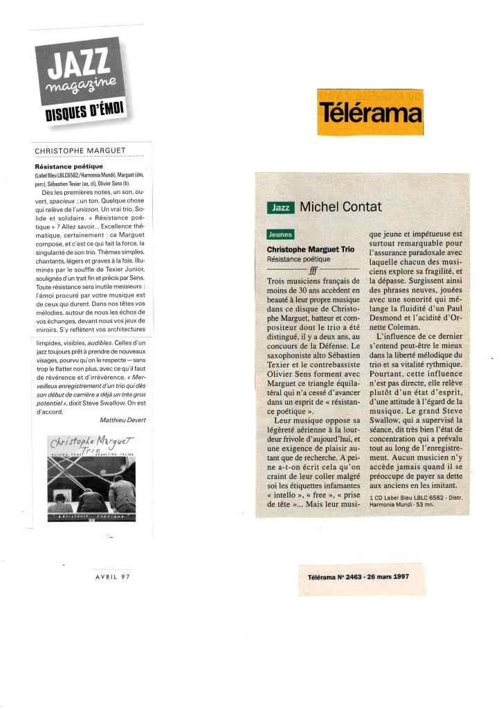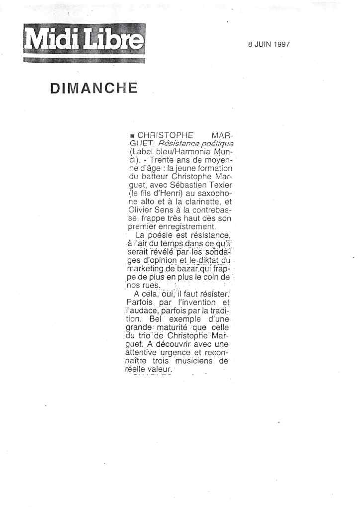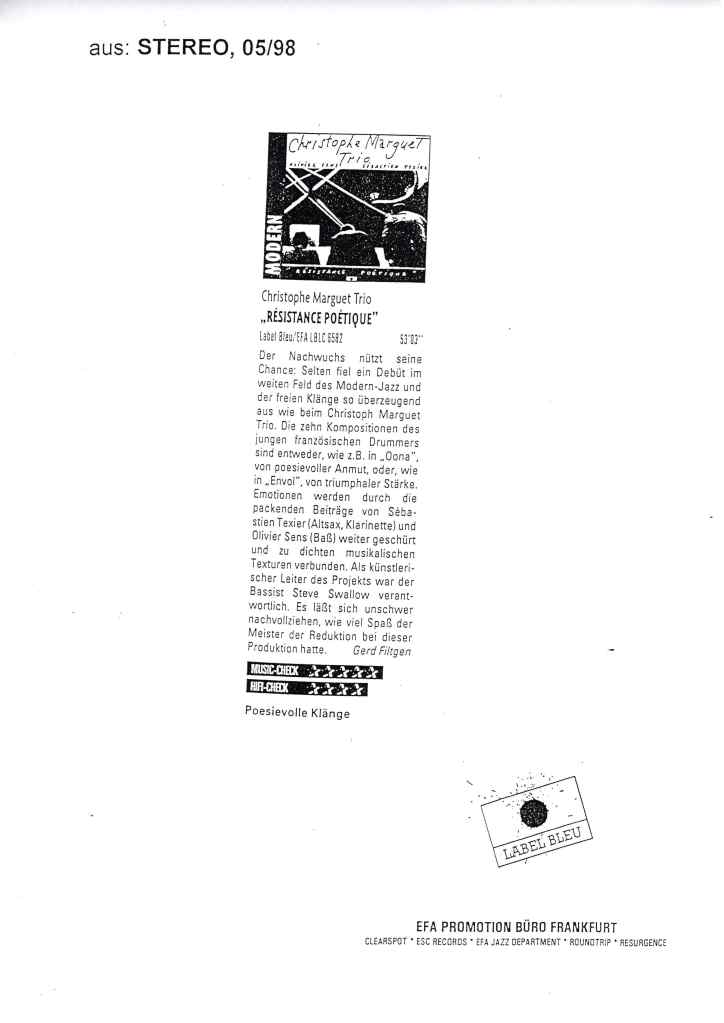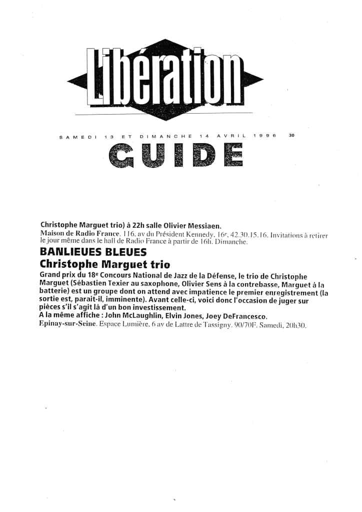 Sébastien Texier : Saxophone alto, clarinette Olivier Sens : Contrebasse Christophe Marguet : Batterie, compositions Steve Swallow : Direction artistique Enregistré et mixé en novembre 1996 par Philippe Teissier du Cros au Studio Gil Evans à Amiens (80) Label Bleu