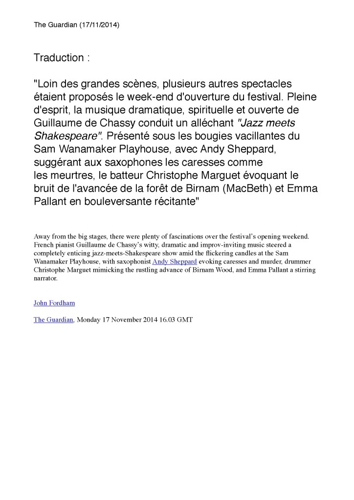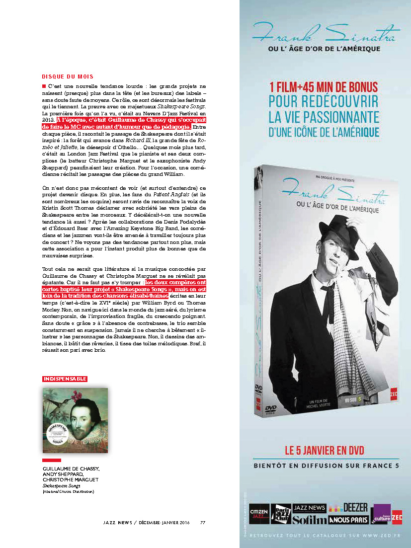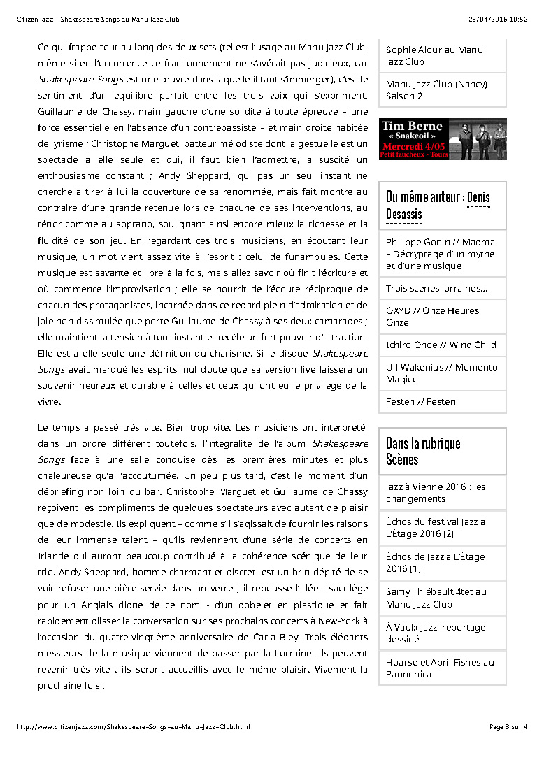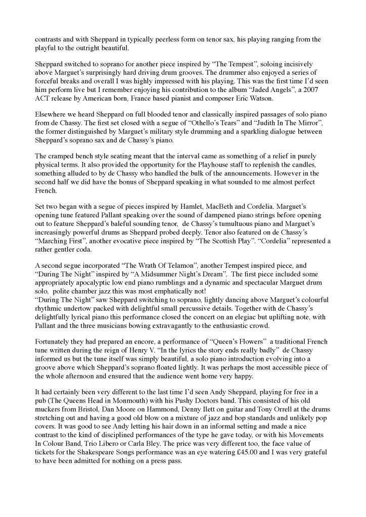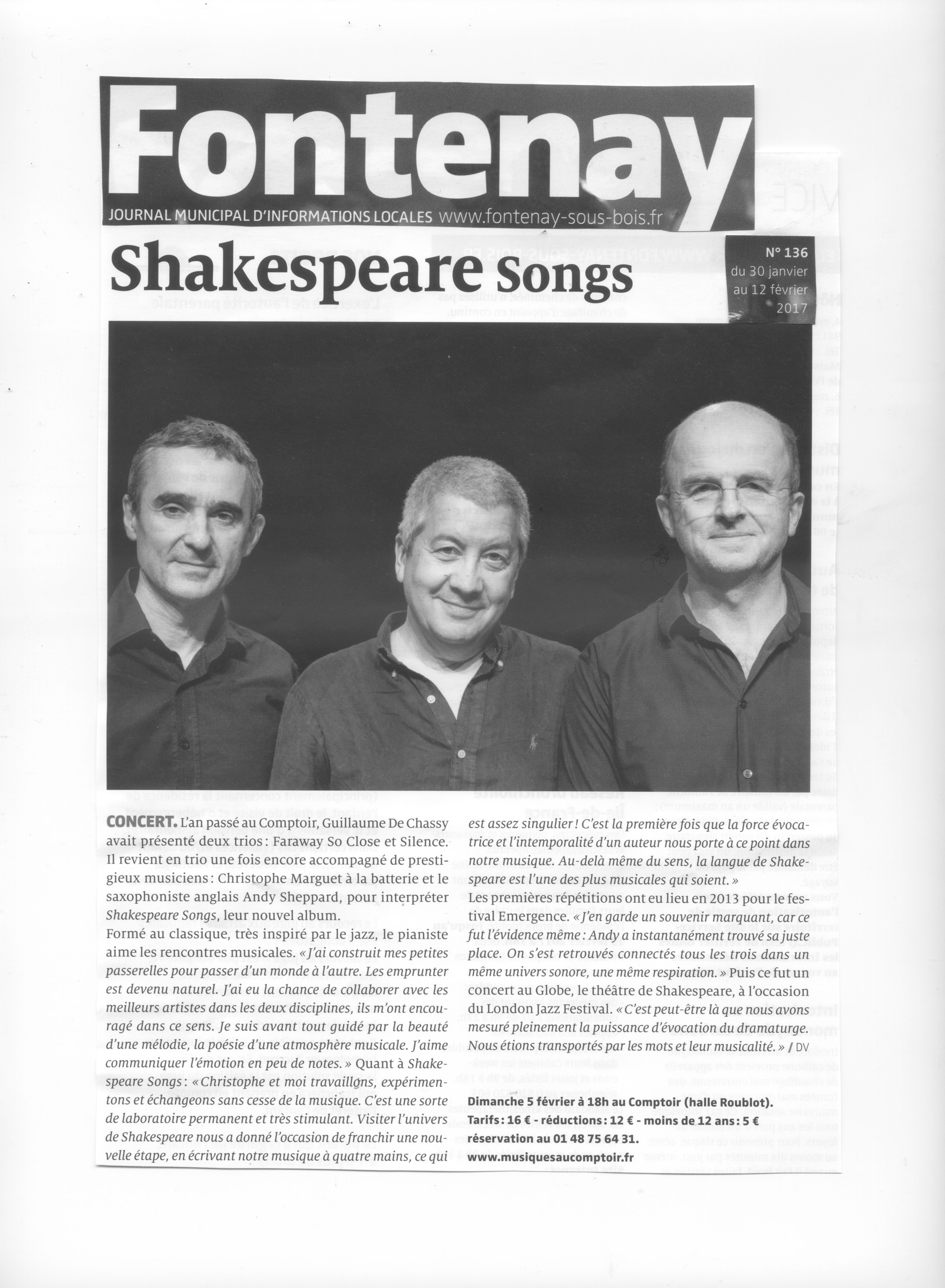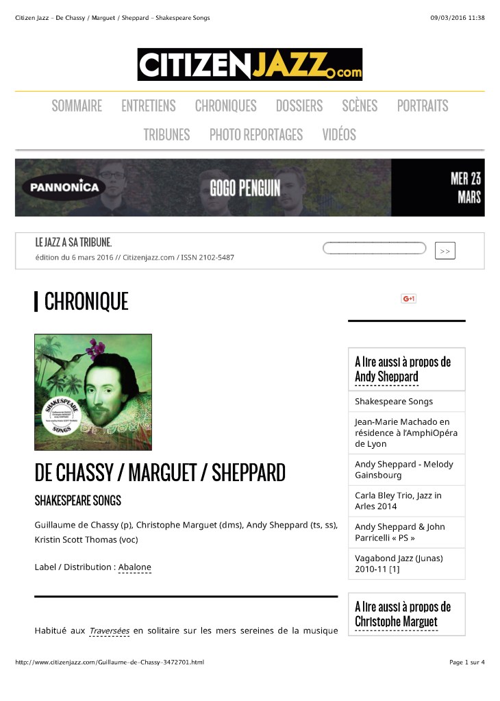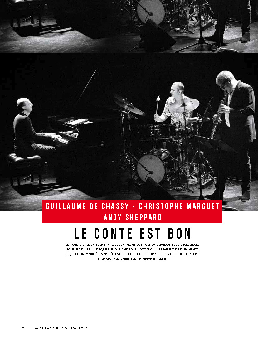Andy Sheppard : Saxophones ténor, soprano Guillaume de Chassy : Piano, compositions Christophe Marguet : Batterie, compositions