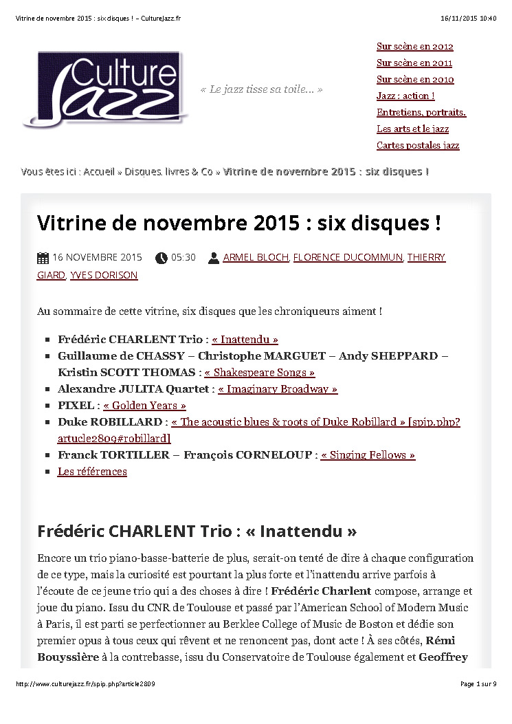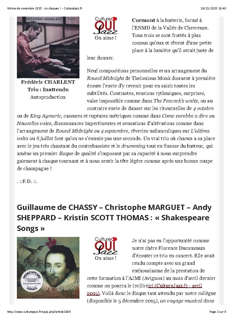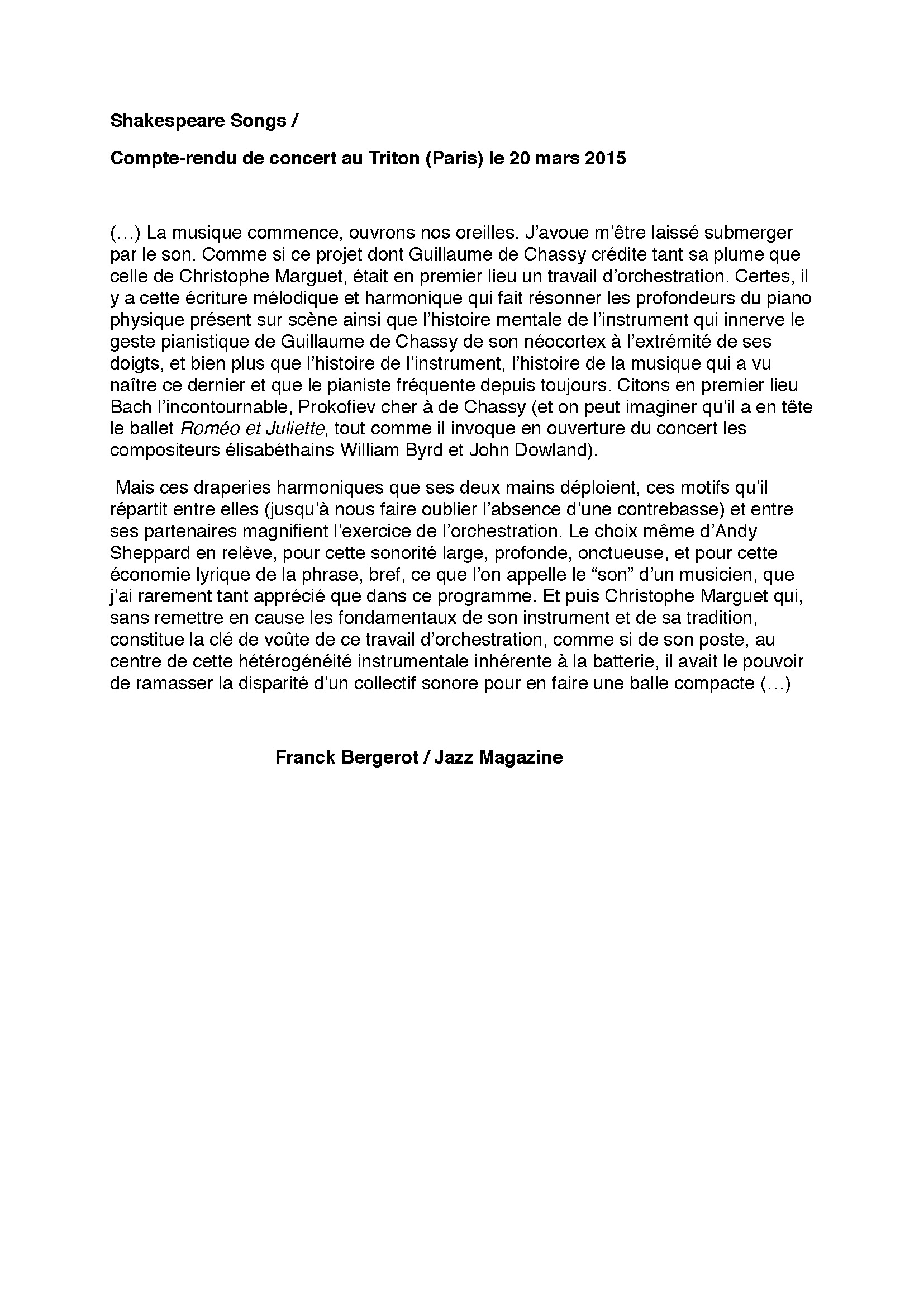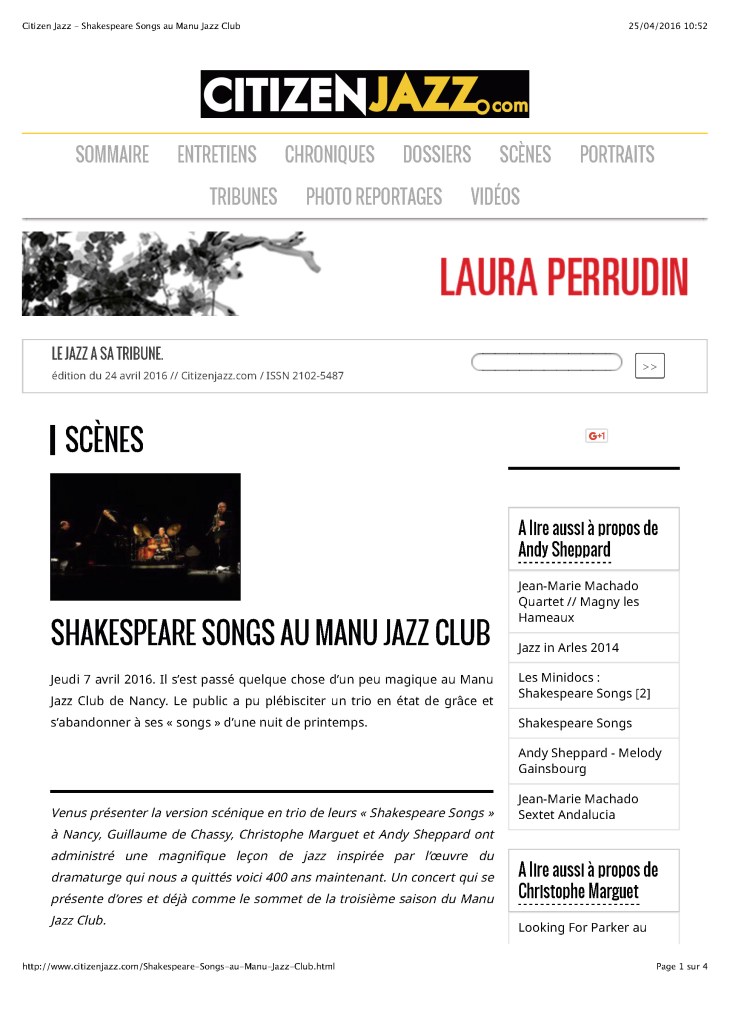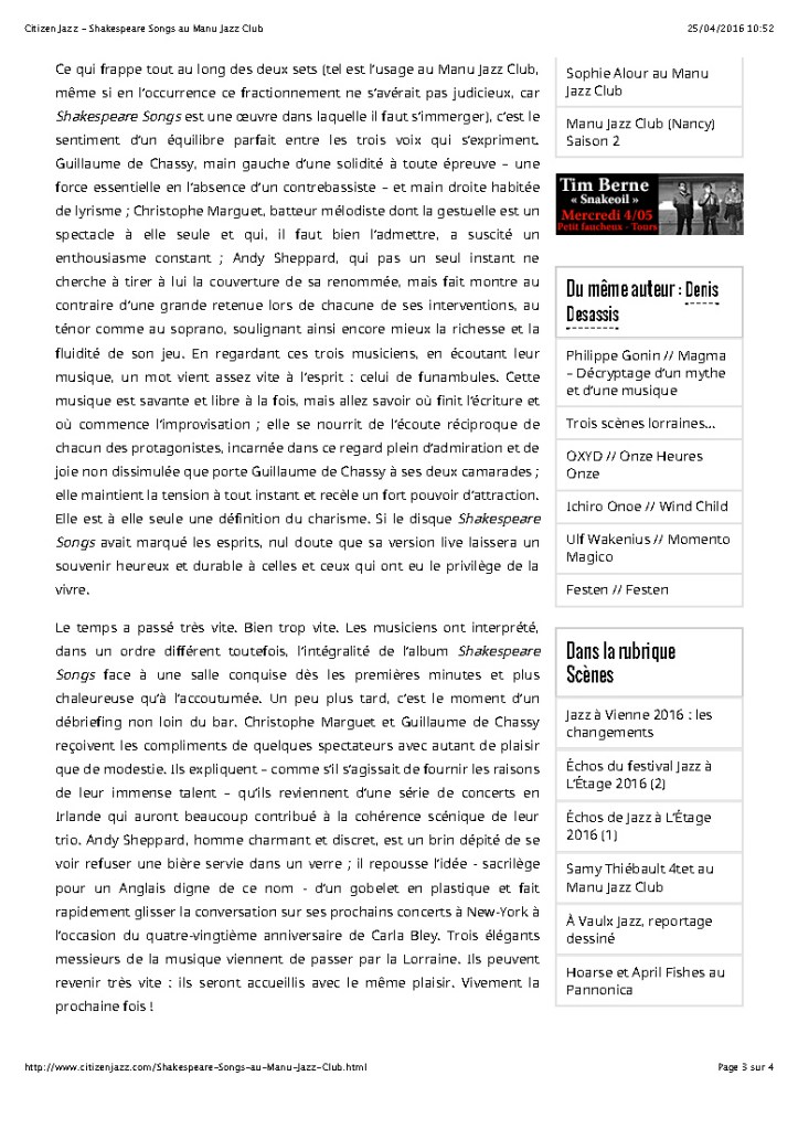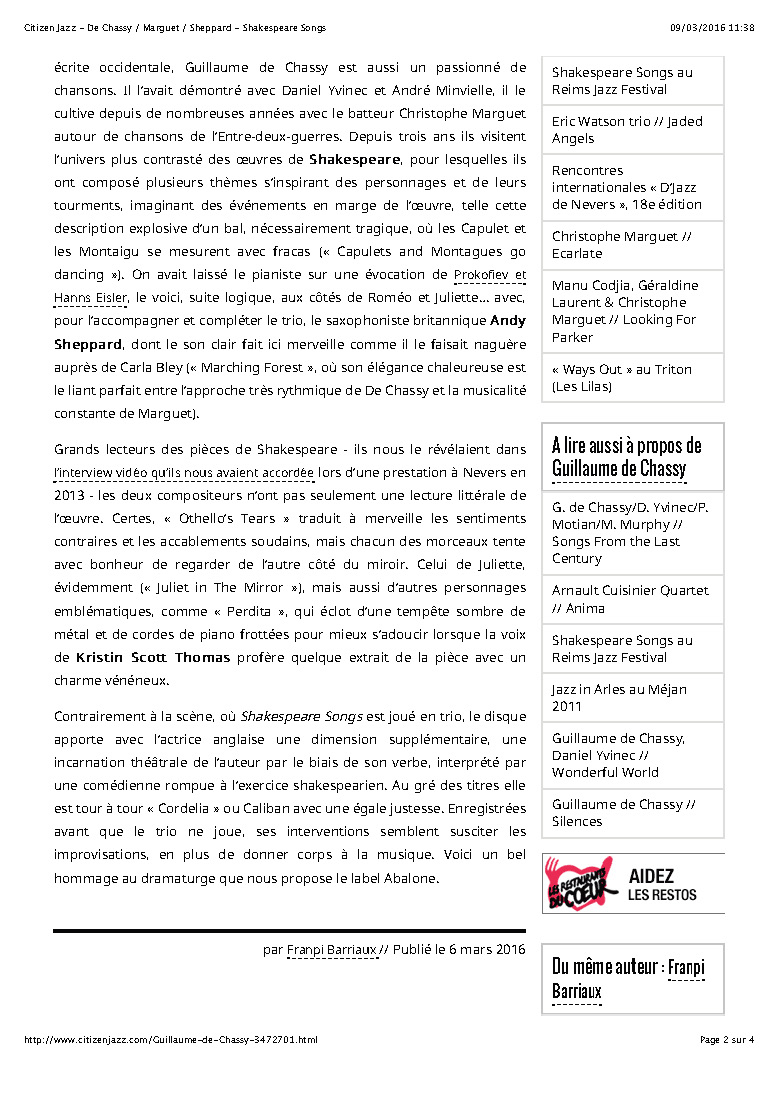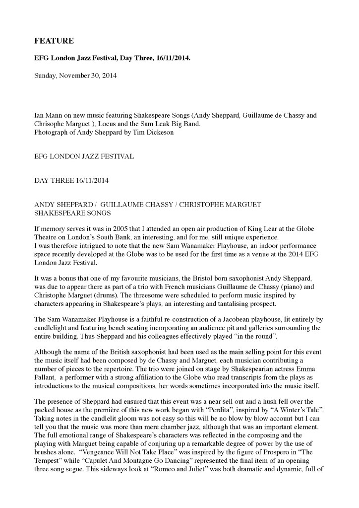 Andy Sheppard : Saxophones ténor, soprano Guillaume de Chassy : Piano, compositions Christophe Marguet : Batterie, compositions